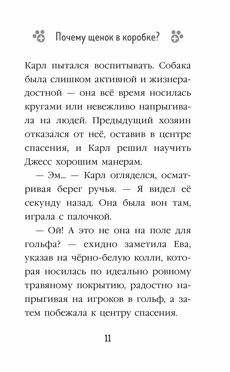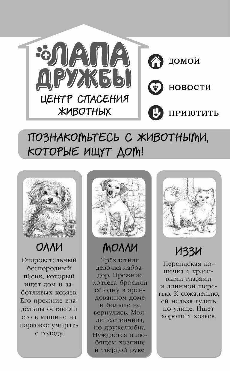 А если говорить о содержании, то эта книга затрагивает одну из самых важных проблем нашего общества, а именно - брошенные домашние животные. В книге вы сможете узнать о работе Центра спасения животных, посмотреть на их важную и нужную деятельность изнутри. Так же на мой взгляд поднимается очень важная проблема почему хозяева иногда вынуждены расставаться со своими любимцами и как для обеих сторон это сложно, а еще много других очень важных моментов которые вы после прочтения сможете обсудить с ребенком (в том числе, почему дети за родителей не в ответе и даже важный момент для взрослых - нужно уметь слышать своих детей).