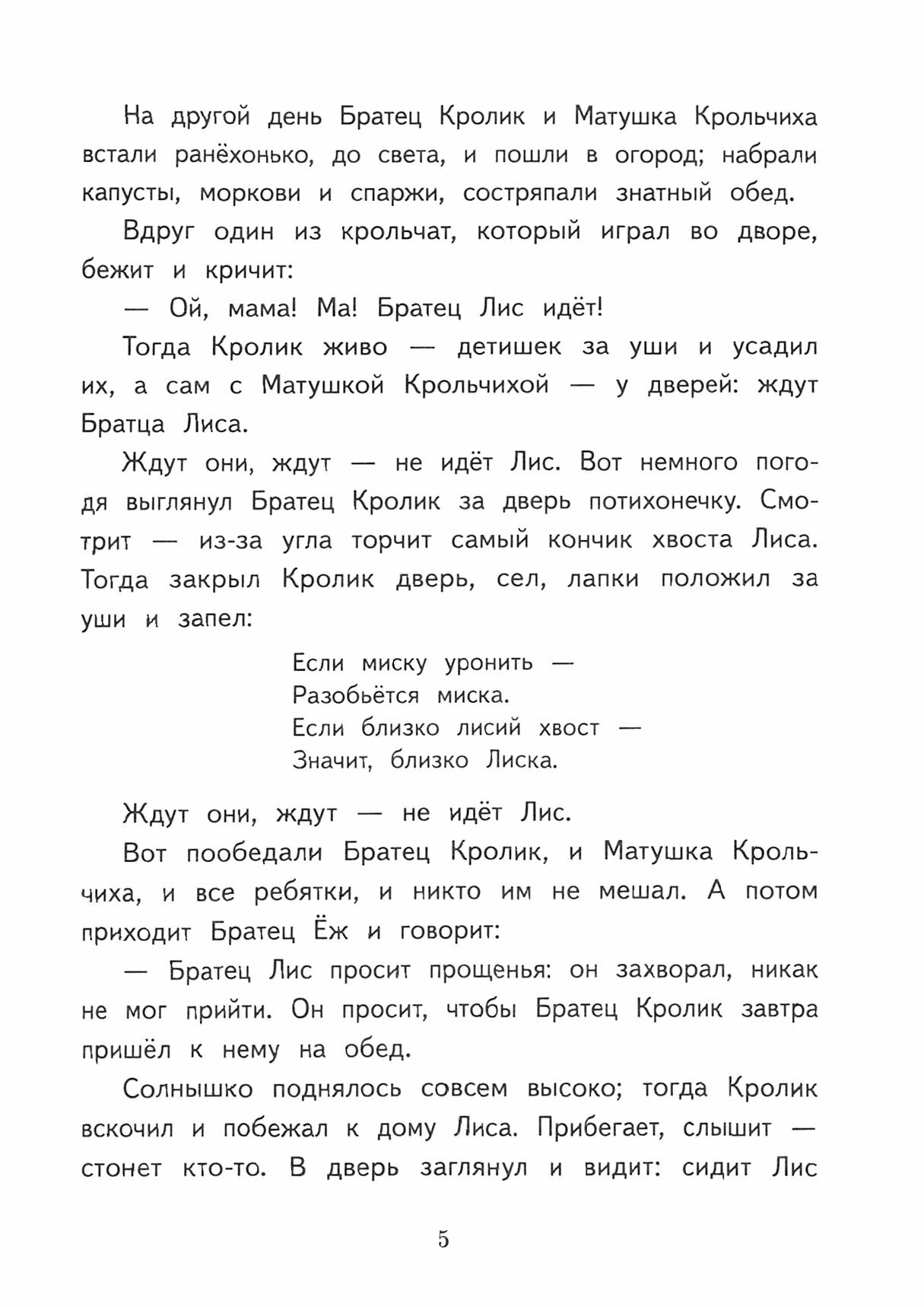 Каждый вечер маленький Джоэль прибегает к дядюшке Римусу, чтобы послушать сказку о братце Кролике и его друзьях - братце Лисе, братце Черепахе, матушке Мидоус и многих других. Давным-давно американский писатель Д. Харрис услышал и записал эти сказки, чтобы дети во всем мире смогли их прочитать.