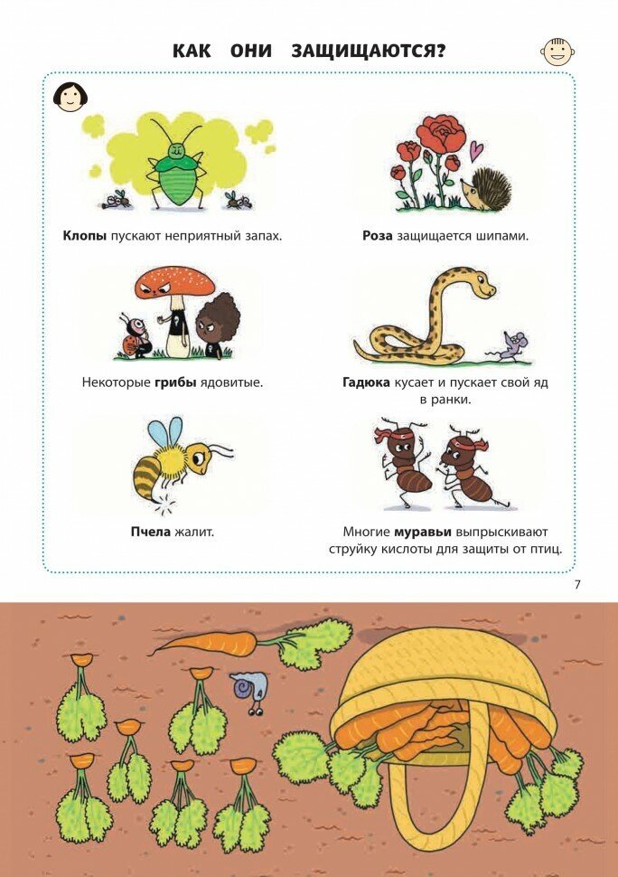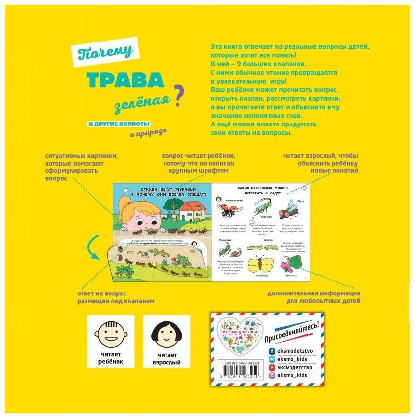 Почему трава зеленая? Что едят черви? Почему у улиток нет лапок? И еще многие другие вопросы, на которые сразу трудно ответить ребенку. Вам в помощь - это книга с ситуативными картинками и клапанами. За каждым клапаном содержится ответ. Вы можете превратить ваше совместное чтение в увлекательную игру: ваш малыш читает вопрос, открывает клапан, а вы читаете ответ и поясните ему то, что непонятно. А еще можно придумать свои ответы на вопросы.