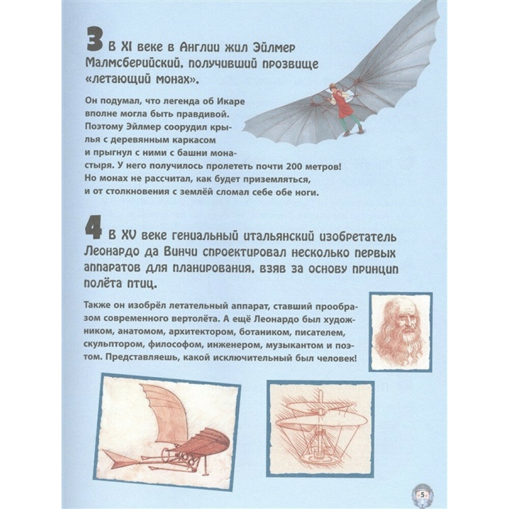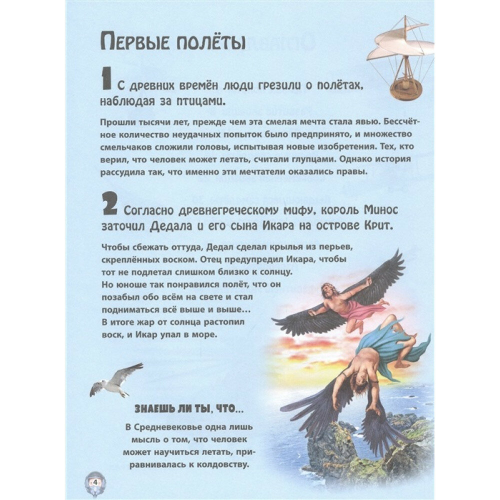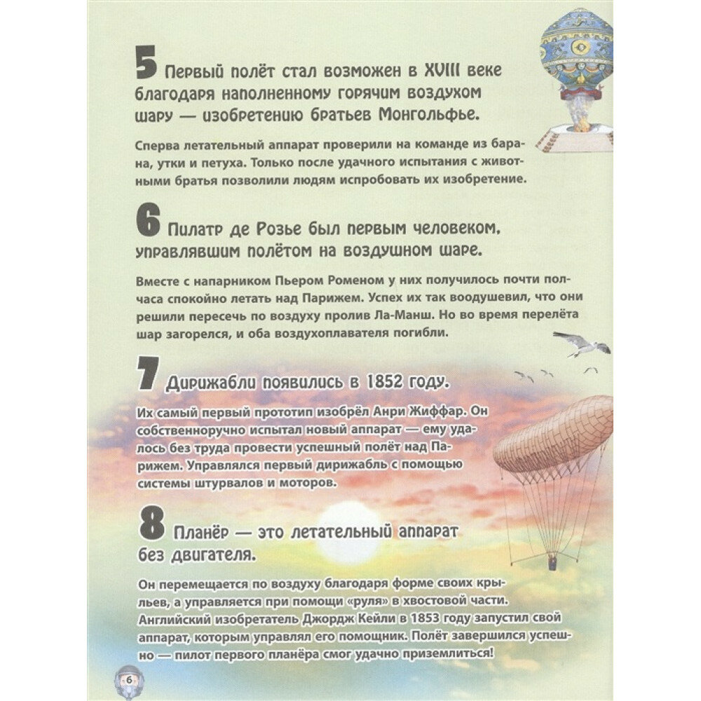 Чем знаменит "летающий монах"? Существуют ли плавающие аэропорты? Как в военных целях использовались дирижабли? Эта увлекательнейшая книга даст ответы на все эти и многие другие вопросы о летательных аппаратах! Перелистывая её страницы и рассматривая яркие картинки, ребята будут всё глубже и глубже погружаться в невероятный мир авиации!