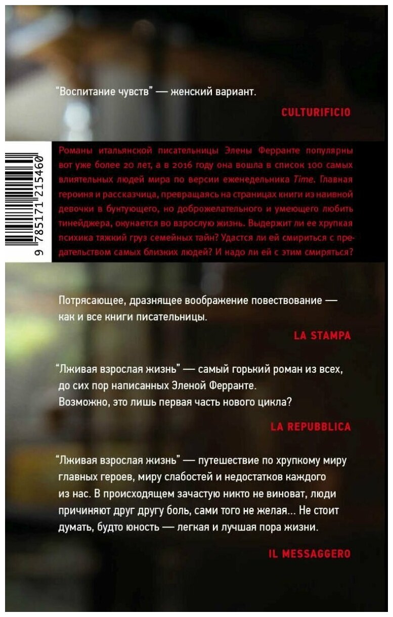 "Лживая взрослая жизнь" - это захватывающий, психологически тонкий и точный роман о том, как нелегко взрослеть. Главной героине, она же рассказчица, на самом пороге юности приходится узнать множество семейных тайн, справиться с грузом которых было бы трудно любому взрослому. Предательство близких, ненависть и злобные пересуды, переходящая из рук в руки драгоценность, одновременно объединяющая и сеющая раздоры… И первая любовь, и первые поцелуи, и страстное желание любить и быть любимой… Как же сложно быть подростком! Как сложно познавать мир взрослых, которые, оказывается, уча говорить правду, только и делают, что лгут…