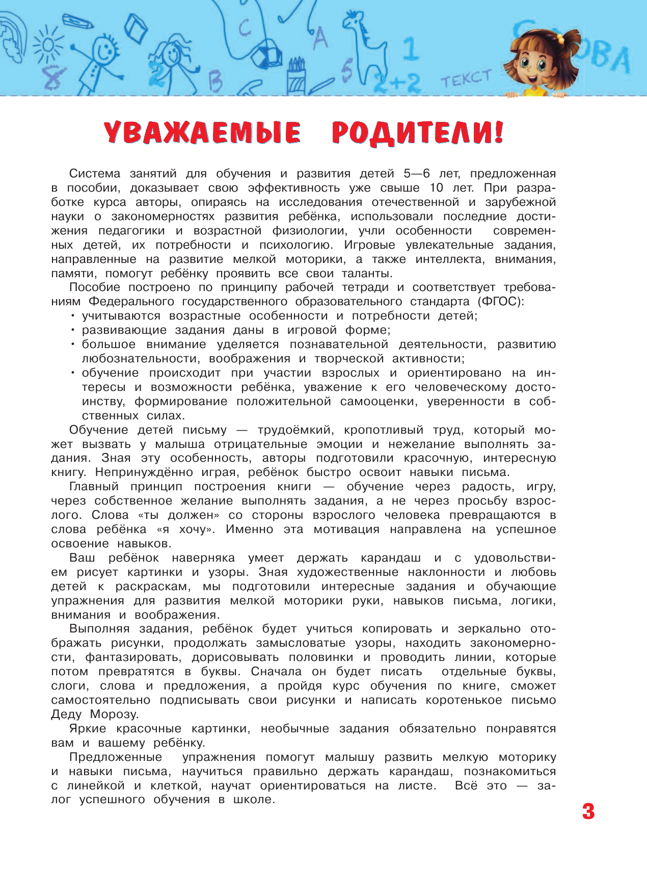 Занимаясь по книге, дошкольник будет рисовать по клеточкам; дорисовывать половинки рисунков и обводить по пунктиру картинки; штриховать; писать в клетках печатные буквы, слоги, а затем и слова; составлять и записывать предложения из нескольких слов. Упражнения ориентированы не только на развитие мелкой моторики рук, но расширение кругозора ребенка. Каждая тема посвящена какой-либо букве, таким образом, ребёнок легко выучит алфавит. Обучение письму начинается с обводки по пунктирным линиям, и лишь затем предлагается написание отдельных букв, слогов, слов, предложений. Игровая форма подачи материала и красочные иллюстрации повысят интерес ребёнка к занятиям.