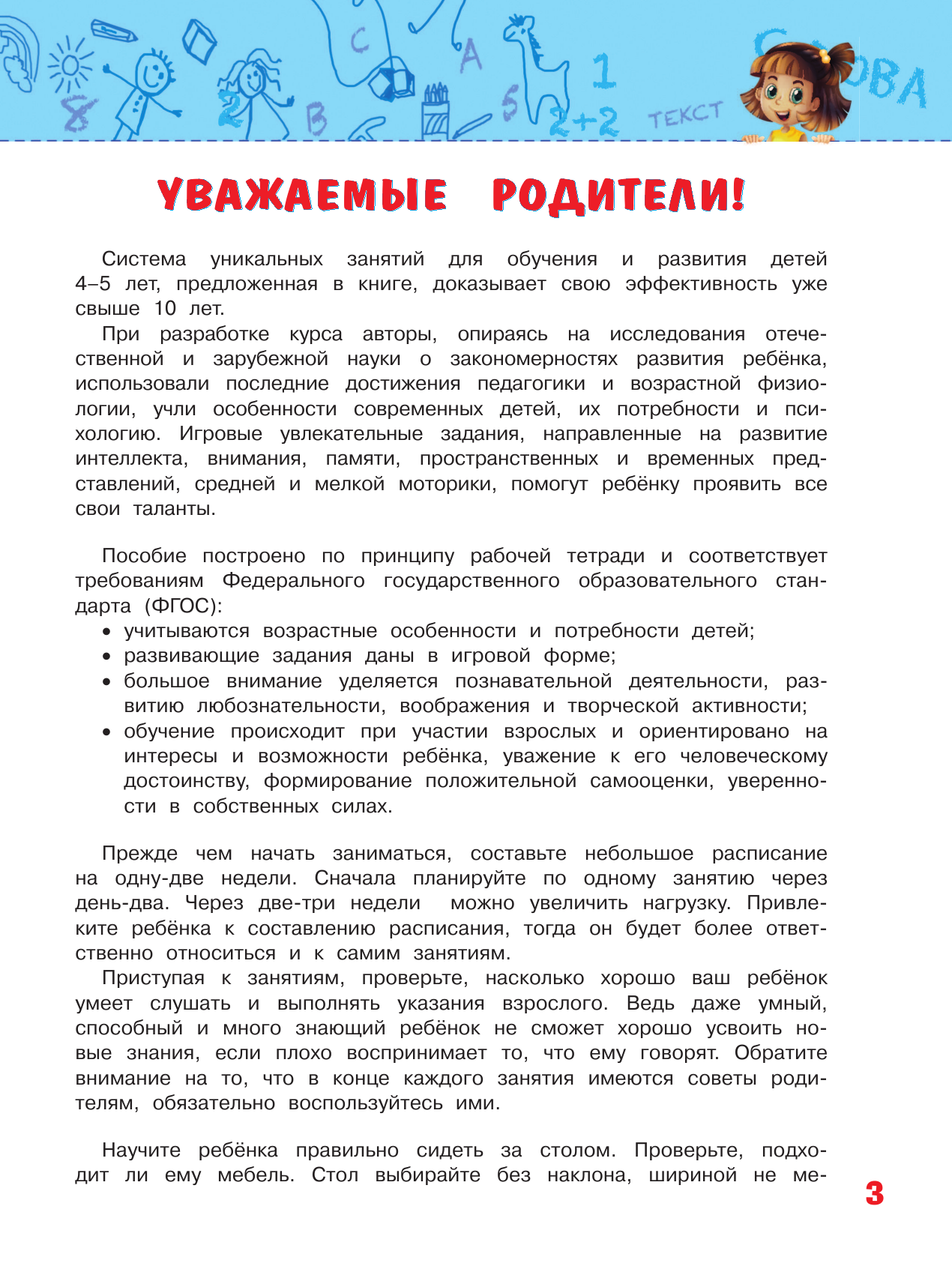 Книга будет отличным помощником в обучении и развитии детей 4-5 лет. Пособие предназначено для формирования у дошкольника элементарных математических представлений. Занимаясь по пособию, ребёнок познакомится с числами в пределах 10 и геометрическими фигурами, научится ориентироваться в пространстве и на листе бумаги, потренирует внимание, память, логическое мышление и т. д.