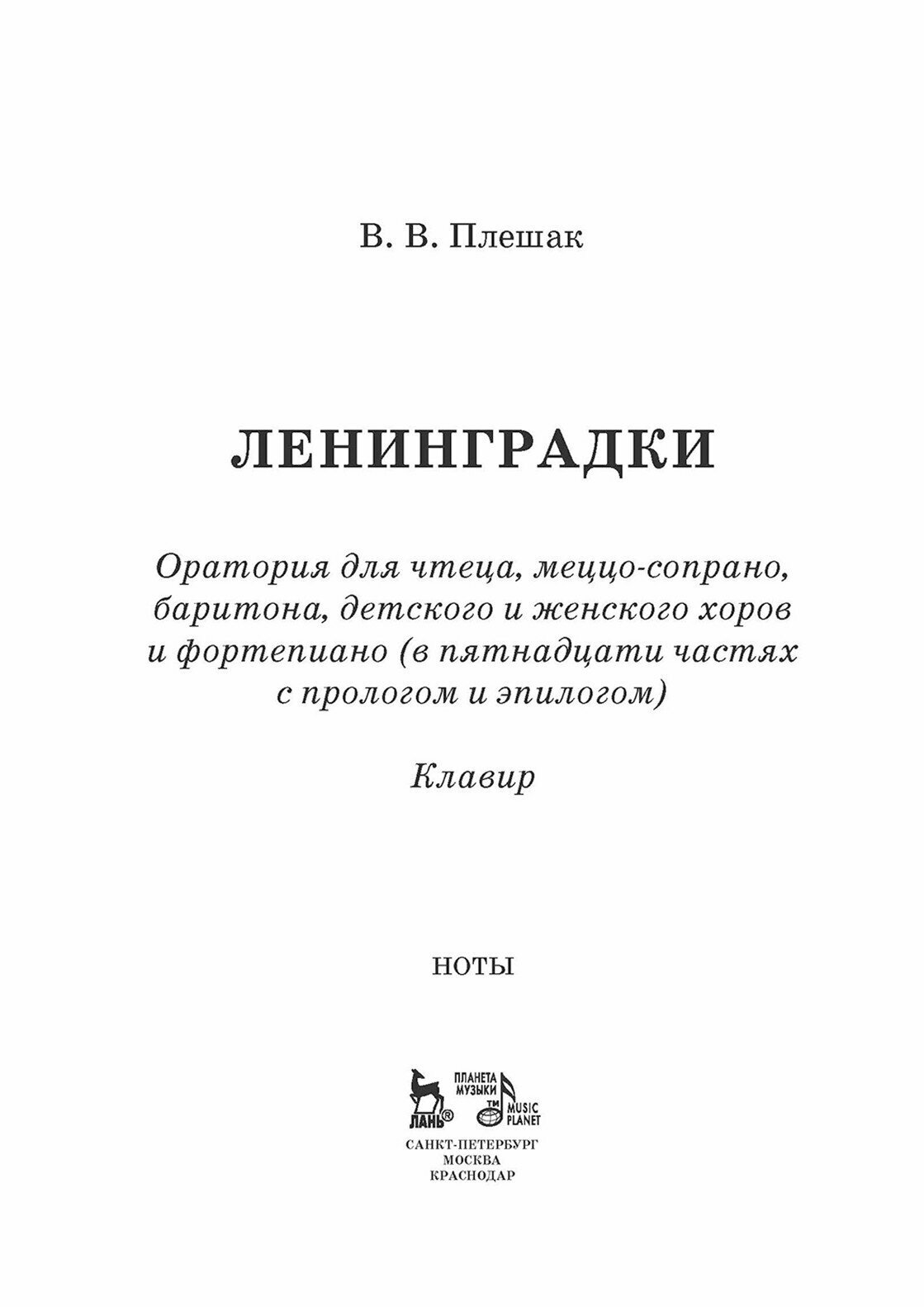 Сервис сравнения цен СкидкаГИД предлагает сравнить цены на товар «Книга: "Ленинградки". Оратория для чтеца меццо-сопрано баритона детского и женского хоров и фортепиано (В. В. Плешак); Издательство «Планета музыки», 2020»