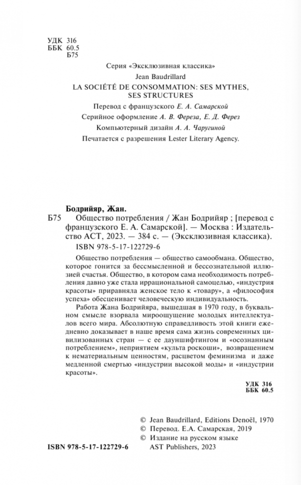 Книга: Общество потребления (Жан Бодрийяр); ООО "Издательство Астрель", 2024