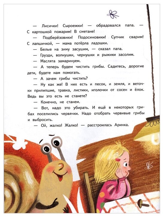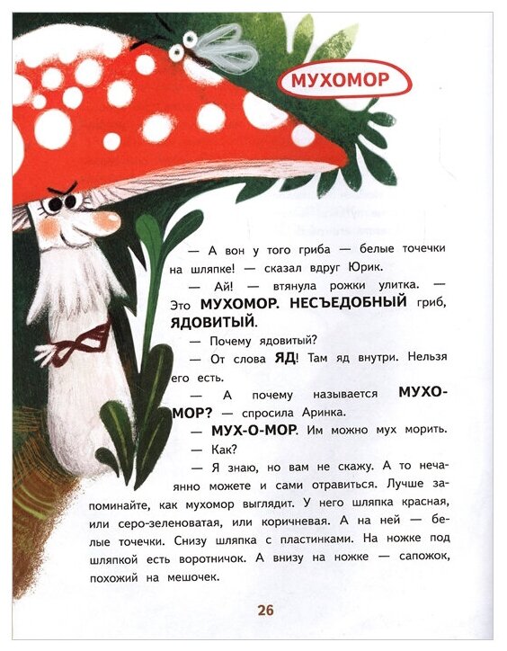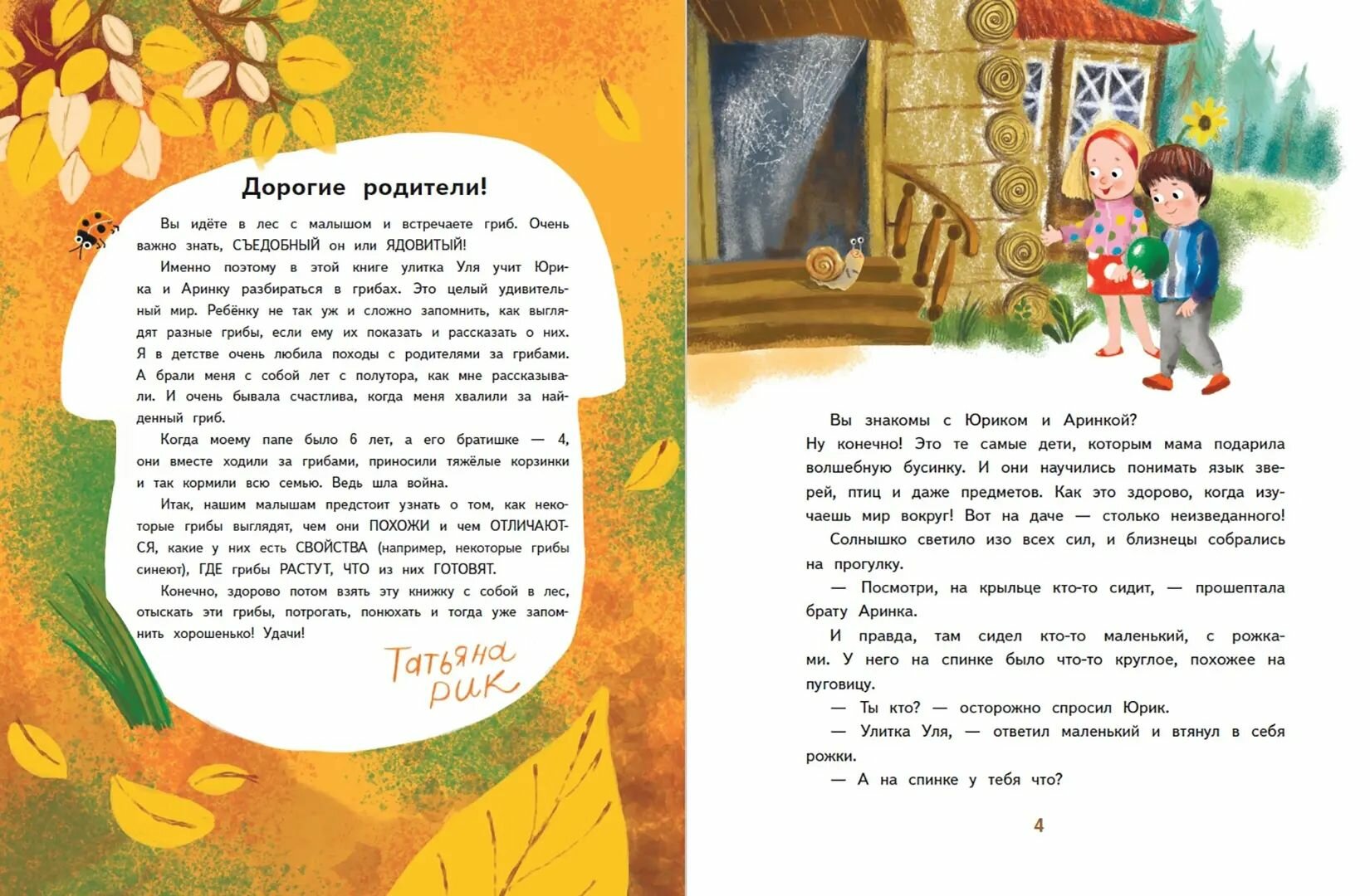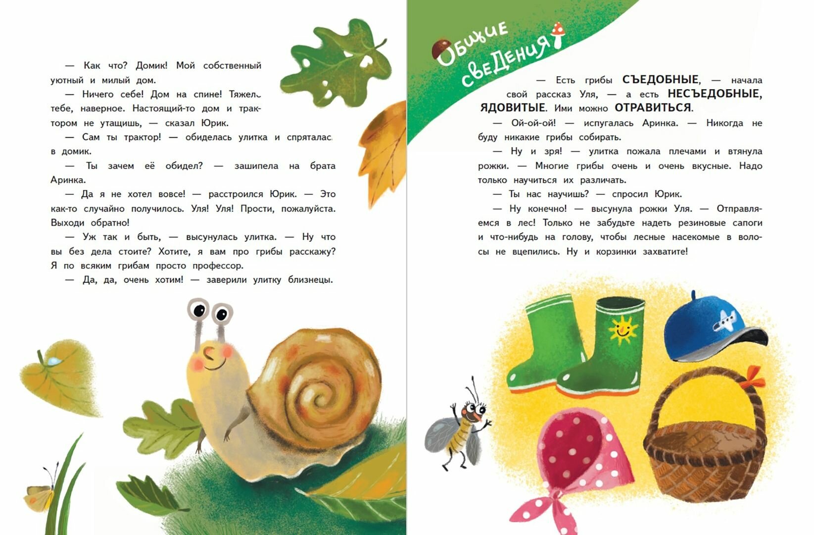 В лесу растут грибы. Это таинственный, удивительный мир! Кто поведёт туда Юрика и Аринку? Ну, конечно, маленькая улитка Уля. Она откусит от каждого грибка по кусочку и расскажет, какие грибы вкусные, какие – нет. А есть грибы совсем несъедобные, ядовитые, опасные! Но не бойтесь, Уля научит отличать хорошие от плохих!
