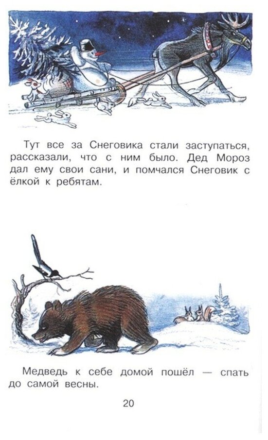 Очень хорошая книга- напомнила моё детство, и советский мультфильм про снеговика,который спешит принести ёлку ребятам на Новый год! Страницы красочные, много рисунков,что можно не читать,а просто рассказывать истории по ним. Сыну два с половиной года, понравилась книга,читаем уже неделю!