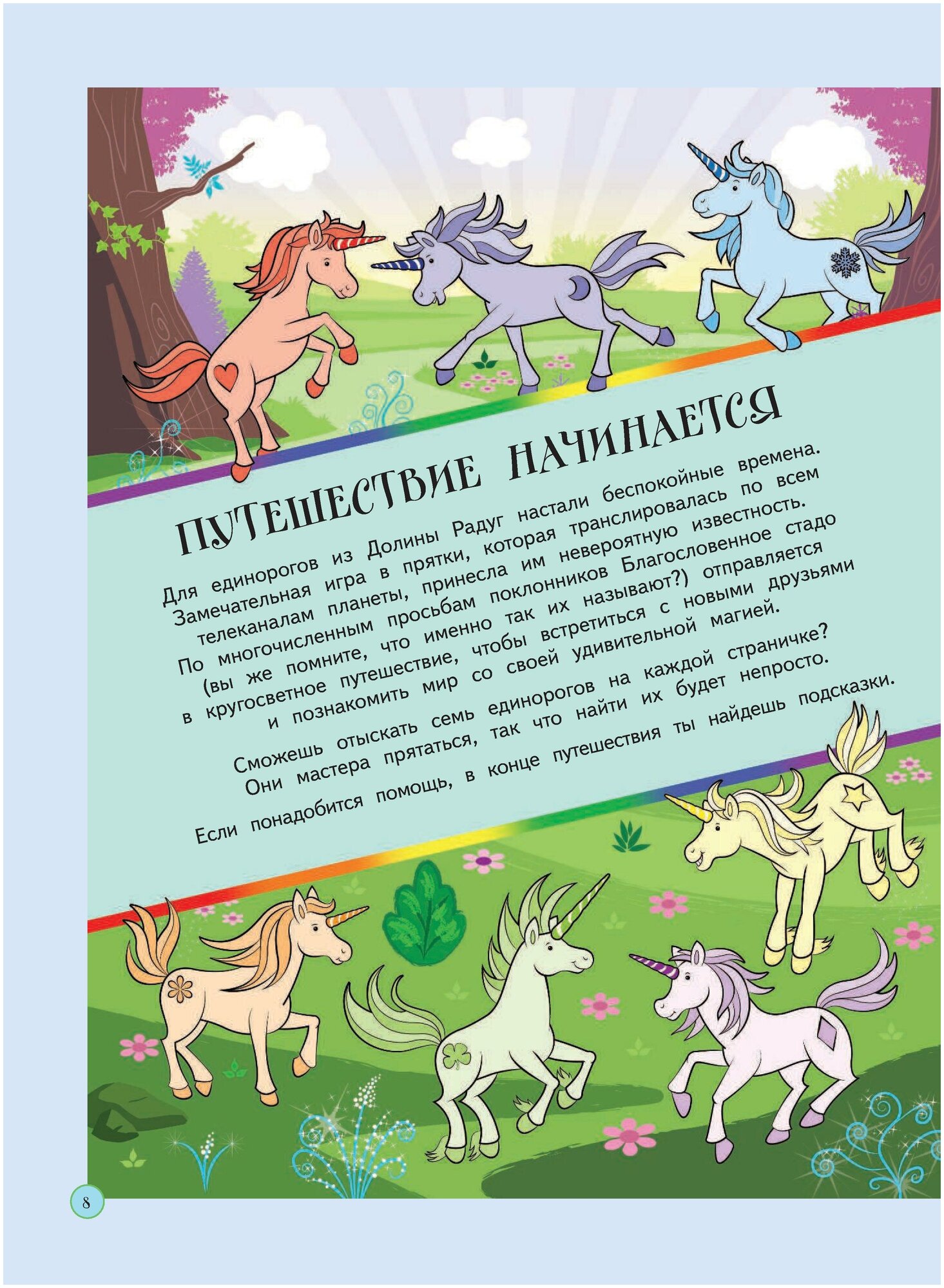 Книжка-искалка, нужно в разных локациях искать единорогов. Картинки яркие и подробные, хотя и довольно минималистичные, искать очень интересно) в конце каждого раздела есть подсказки, и в них есть ещё разные предметы, которые можно попробовать найти на разворотах.