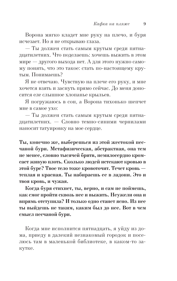 "Я заметил, что на груди белой майки налипло что-то черное, по форме - вроде большой бабочки с раскрытыми крыльями. В мерцающем свете люминесцентной лампы стало понятно: это темно-красное кровавое пятно. Кровь свежая, еще не засохла. Довольно много. Я наклонил голову и понюхал пятно. Никакого запаха. Брызги крови - совсем немного - оказались и на темно-синей рубашке, где она была не так заметна. А на белой майке - такая яркая, свежая. " Кошмарное странствие по лабиринтам души современного Эдипа - в романе Харуки Мураками "Кафка на пляже".