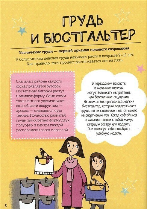 О самом важном. Во-первых, об изменениях тела девочек: о росте груди, росте волос в интимных частях тела, о прыщах, о менструациях.