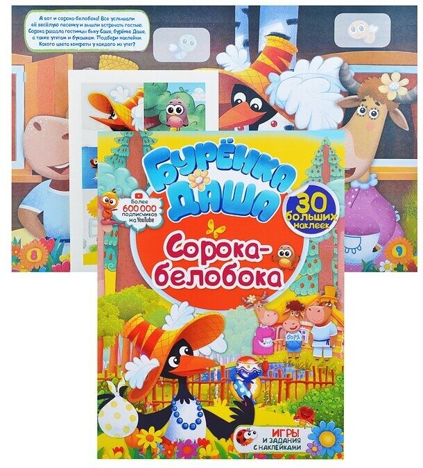 "Буренка Даша" - это уникальный мультипликационный караоке-проект, собравший более 500 тысяч подписчиков на канале YouTube, основан на народных песнях и сказках, а также на авторских историях о главных персонажах: коровке Даше, быке Саше, телёнке Боре и его многочисленных друзьях. В этой истории в гости к Даше придёт сорока-белобока и будет раздавать всем гостинцы. Телёнку Боре придётся постараться, чтобы получить угощение!