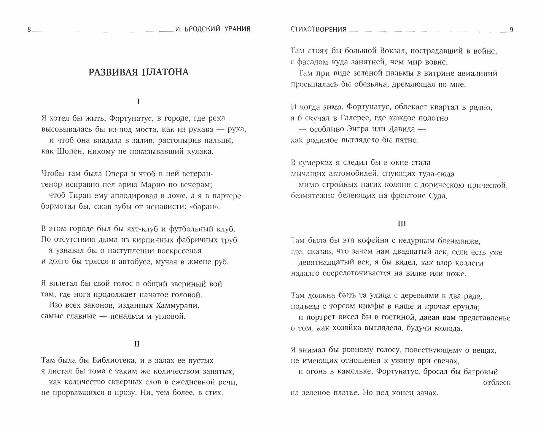 В сборник "Урания" вошли стихотворения 1970-1980-х годов, среди которых "Развивая Платона", "Осенний крик ястреба", "Венецианские строфы", "Римские элегии" и многие другие.