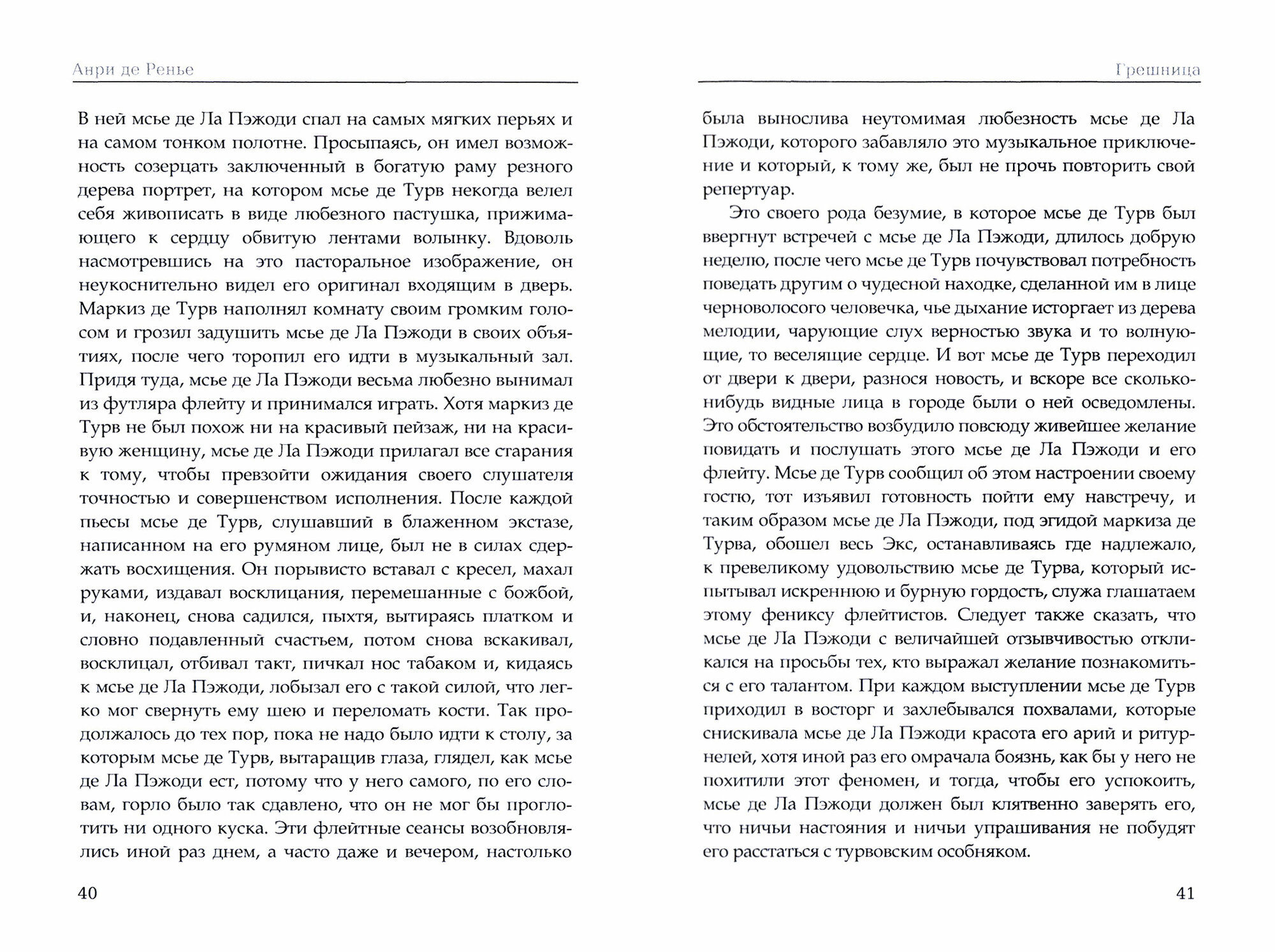 «В иные времена мы оплакиваем погибшие отрады, в иные — содеянные грехи» — эта цитата из Сент-Эвремона стала эпиграфом к повести «Грешница» одного из «последних романтиков» французской литературы, поэта и писателя Анри де Ренье. В своей «истории» писатель ещё раз раскрывает перед читателем загадку любви, которой не подвластны ни времена, ни нравы: все помыслы и поступки героев вне зависимости от эпохи лишь обнажают нашему взгляду внутреннюю драму человеческого чувства, порабощенного гибельной властью любви.