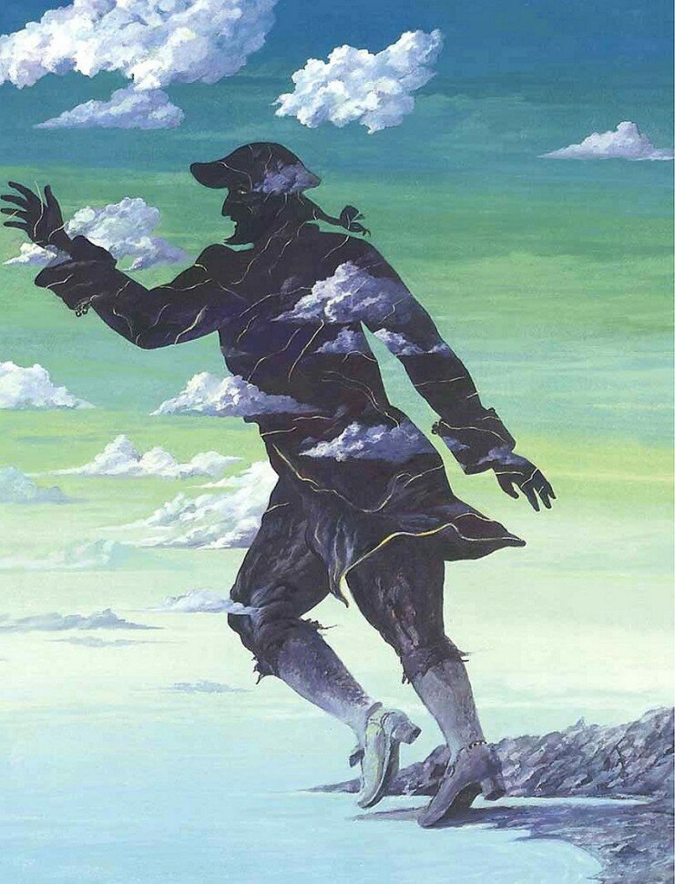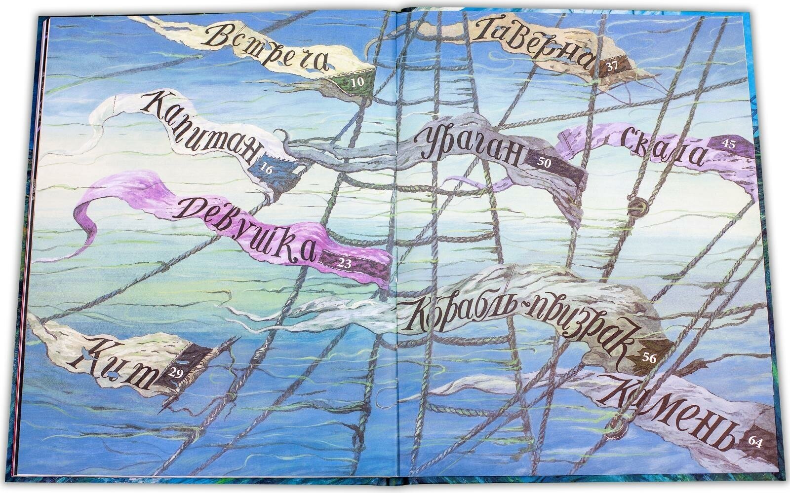 У Сахарнова она изложена в незнакомом мне варианте. В легенду введен кит, преследующий корабль, который в прочитанных ранее вариантах не упоминался, и девушка, ждущая жениха, ушедшего на корабле самоуверенного капитана. Получилось очень достойно и завораживающе - практически мини-роман в готическом духе. Книга не для маленьких детей. И сама легенда, и иллюстрации к ней - это воплощенные мистические страхи и галлюцинации суеверных людей. Аллегорические необычные образы и картины, созданные воображением художника под воздействием текста и воплощенные им в полностраничных иллюстрациях и разворотах, очень впечатляют!