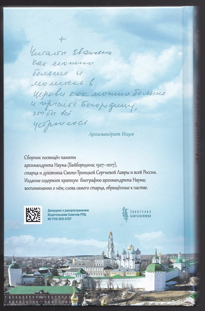 Сборник посвящён памяти архимандрита Наума (Байбородина; 1927-2017), старца и духовника Свято-Троицкой Сергиевой Лавры и всей России. Издание содержит краткую биографию архимандрита Наума; воспоминания о нём; слова самого старца, обращённые к пастве.
