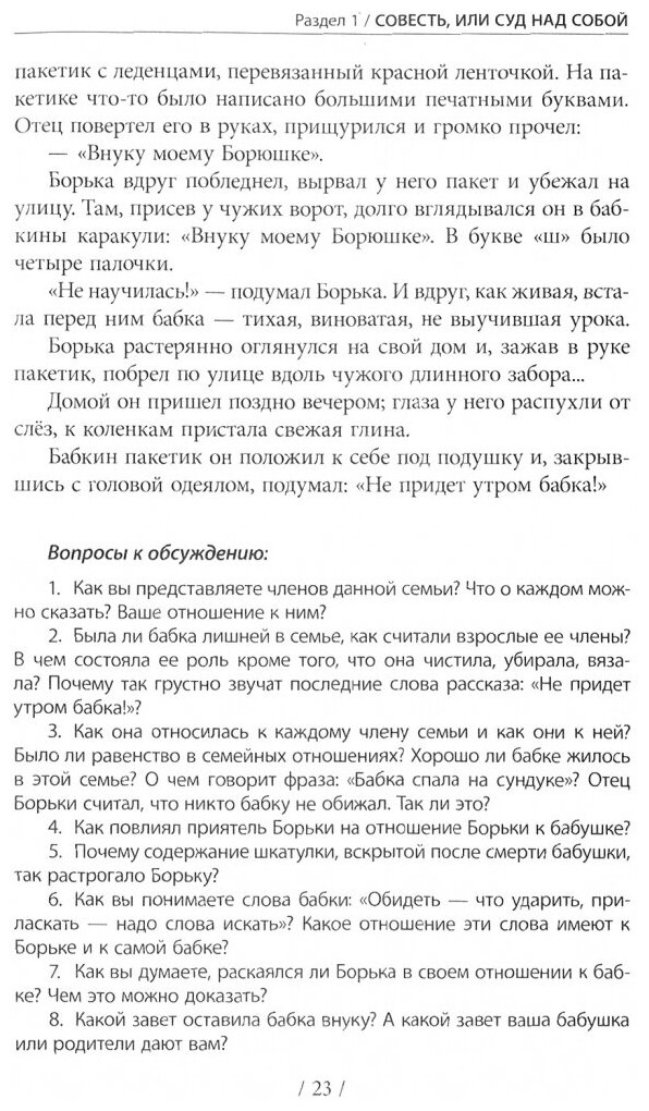 Цель - гуманизировать сознание детей, опираясь на анализ поведения литературных героев и сопереживание с ними. За основу взят "оперативный" для воздействия на читателя жанр рассказа, раскрывающий близкую опыту ребенка ту или иную жизненную ситуацию и ее разрешение. Отобранные для обсуждения лучшие рассказы отечественных авторов сгруппированы в тематические разделы: "В ответе за тех, кого приручил", "Совесть, или Суд над собой", "О шутке всерьез", "О силе воли и силе духа" и др.