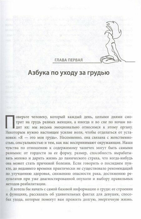 Пот-ря-са-ю-ща-я книга. Серьёзно. Наполненная массой полезнейшей информации о здоровье груди и профилактике, лечении и диагностике непростых заболеваний, она способна изменить взгляд многих людей на привычные нам вещи и легко отказаться от вредных привычек (но это– капля в море), пересмотреть своё отношение к регулярным медицинским обследованиям. Книга читается легко, написана с долей юмора, но это отнюдь не развлекательное чтиво. Каждой женщине очень рекомендую ознакомиться с содержимым этого объёмного пособия. Автор соблюдает идеальный баланс между научными исследованиями и практическими рекомендациями.