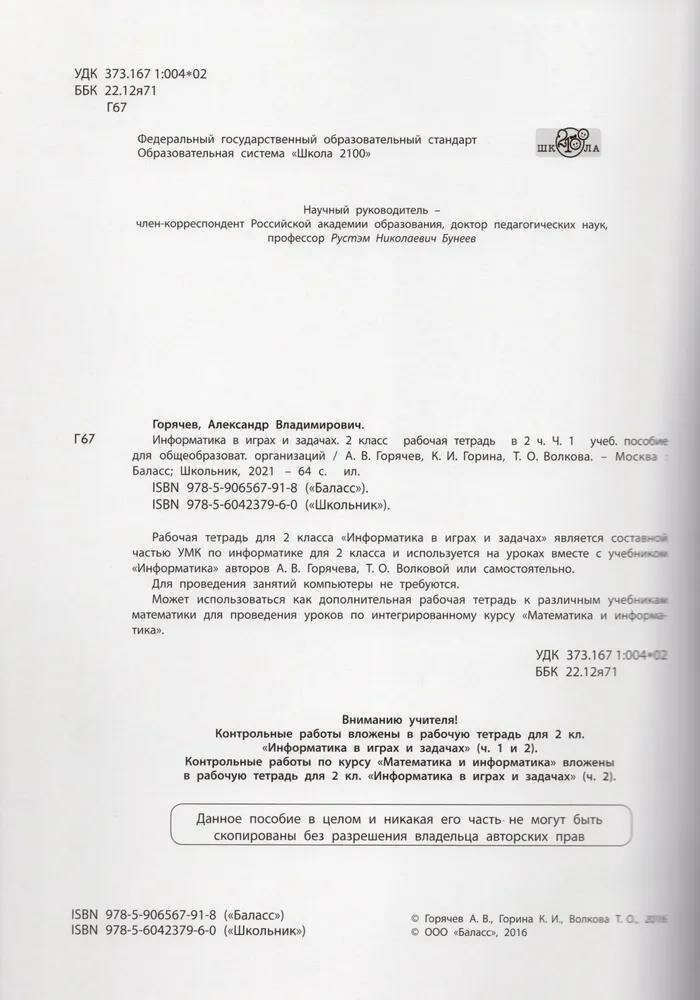 Рабочая тетрадь "Информатика в играх и задачах" для 2 класса является составной частью УМК по информатике для 2 класса и используется на уроках вместе с учебником "Информатика" авторов А.В. Горячева, Т.О. Волковой или самостоятельно.