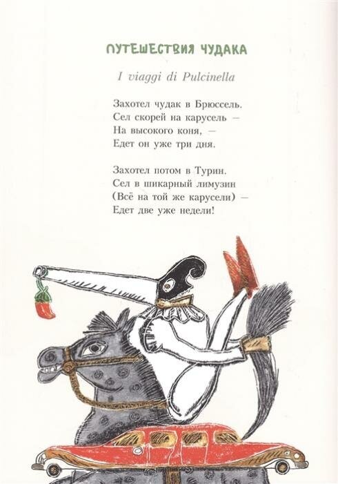 В сборник вошли стихи Джанни Родари, написанные в разные годы. В них слышны отголоски итальянского поэтического фольклора, который по-итальянски называется "филастрокке". Поэт и переводчик Татьяна Стамова бережно перевела их на русский язык, сохранив певучесть языка и юмор, свойственный творчеству автора и итальянской поэзии в целом.
