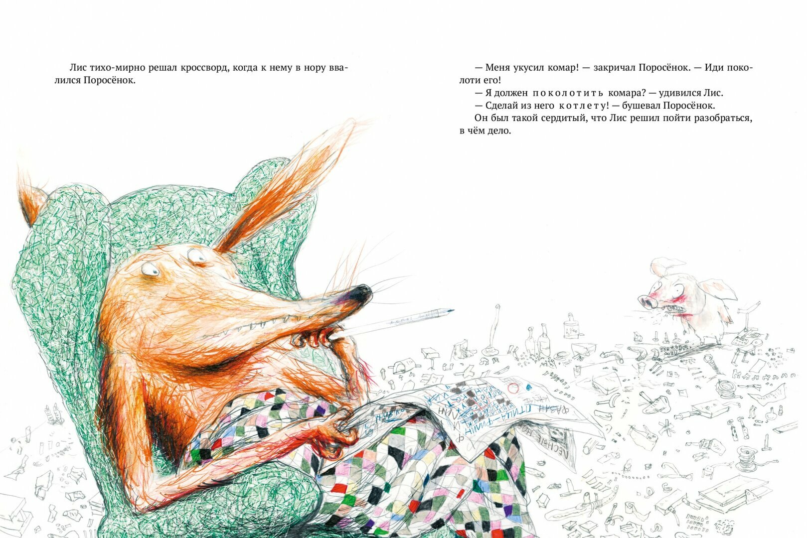 Всегда с нетерпением ждем новинку про Лиса и Поросенка! Самая любимая по -прежнему остается Акулиска! Птичий хвост и Леопардоз, ребенок не забраковала, но и перечитывать как Акулиску по 100 раз не просит! Ну, вот дождались , новенькую.Ура! Смешно! И Акулиска появится, и (о , боги тут про пуки слона!!))) Впечатлительным или тем кто не оценил эту серию, наверно будет жуть как не смешно! А, нам смешно, возраст знаете ли такой! Варево для обугливания комаров вышло конечно отменное, И поросенышь смешнючий, когда его укусил комар, он прибежал к Лису и сказал, чтобы тот сделал из комара котлету! И вот тут мы поняли, эта история будет перечитываться точно) -