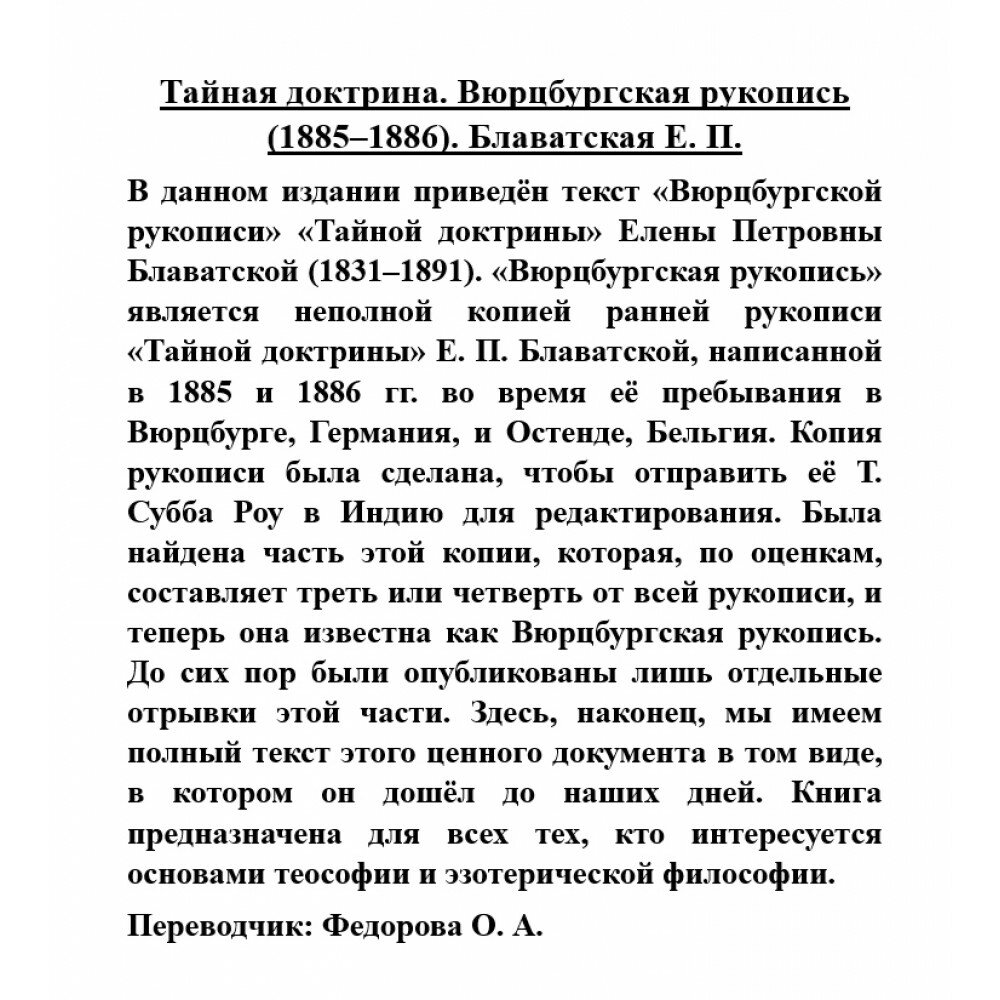 В данном издании приведён текст «Вюрцбургской рукописи» «Тайной доктрины» Елены Петровны Блаватской (1831–1891). «Вюрцбургская рукопись» является неполной копией ранней рукописи «Тайной доктрины» Е. П. Блаватской, написанной в 1885 и 1886 гг. во время её пребывания в Вюрцбурге, Германия, и Остенде, Бельгия. Копия рукописи была сделана, чтобы отправить её Т. Субба Роу в Индию для редактирования. Была найдена часть этой копии, которая, по оценкам, составляет треть или четверть от всей рукописи, и теперь она известна как Вюрцбургская рукопись. До сих пор были опубликованы лишь отдельные отрывки этой части. Здесь, наконец, мы имеем полный текст этого ценного документа в том виде, в котором он дошёл до наших дней. Книга предназначена для всех тех, кто интересуется основами теософии и эзотерической философии.