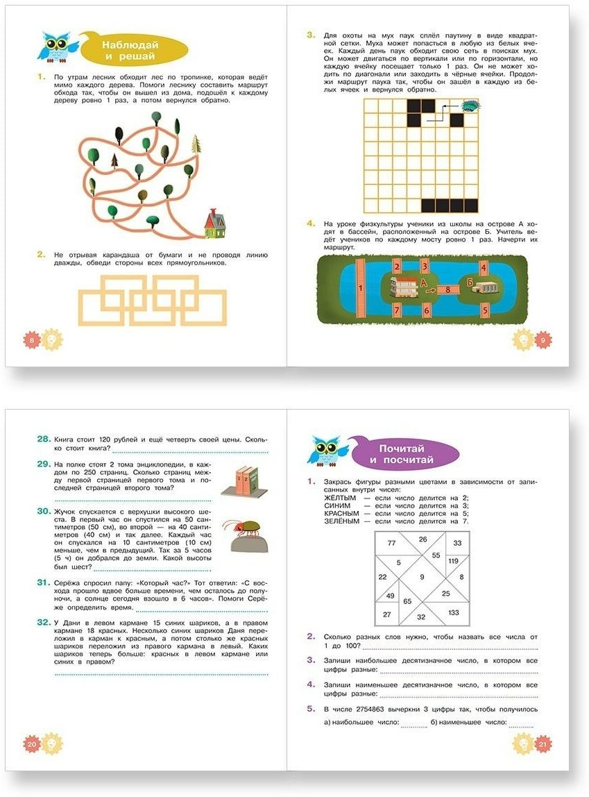 Это четвертая часть данной серии. Книга очень понравилась и оформлением (белая, достаточно плотная бумага, забавные иллюстрации), и содержанием. Материал разбит на блоки, каждый из которых отрабатывает определенные навыки (внимание наблюдательность, логическое, пространственное, абстрактное мышление). Следует отметить связь предложенных заданий с темами школьной программы. В данной части это начальные знания по геометрии, дроби, умножение и деление многозначных чисел. Уделено внимание заданиям на вес, объем. Особая благодарность авторам за раздел "Решения и ответы", в котором даны очень подробные и понятные объяснения к задачам. Над некоторыми заданиями приходилось поломать голову вместе с ребенком, что опять-таки в плюс изданию (совместная работа родителя и ребенка всегда на пользу обеим сторонам).Очень хорошая вступительная статья-обращение к родителям и учителям. В целом, отличное издание как для детей, увлекающихся математикой, так и для пробуждения интереса к этому предмету (книга содержит много неизбитых, нестандартных заданий, а это всегда увлекает). Не зря подзаголовок книги - "Нескучная рабочая тетрадь". Скучно не будет!