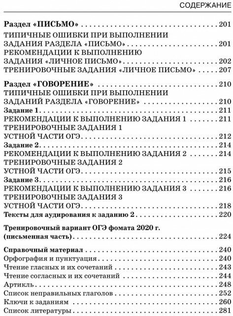 В справочнике представлены все разделы письменной части экзамена: "Аудирование", "Чтение", "Грамматика и лексика", "Письмо" - и его устная часть (задания по говорению в новом формате).
