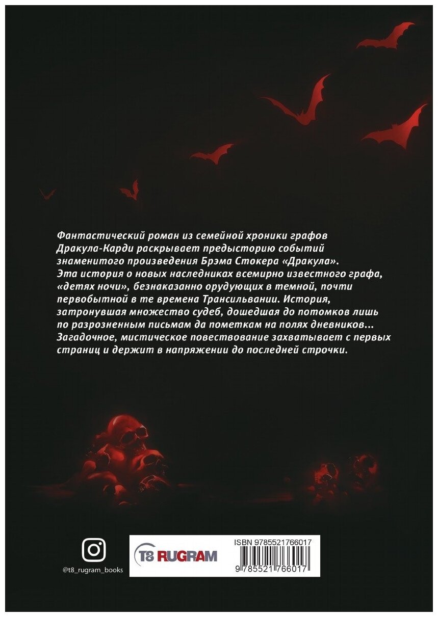 Фантастический роман из семейной хроники графов Дракула-Карди раскрывает предысторию событий знаменитого произведения Брэма Стокера "Дракула". Эта история о новых наследниках всемирно известного графа, "детях ночи", безнаказанно орудующих в темной, почти первобытной в те времена Трансильвании. История, затронувшая множество судеб, дошедшая до потомков лишь по разрозненным письмам да пометкам на полях дневников... Загадочное, мистическое повествование захватывает с первых страниц и держит в напряжении до последней строчки.