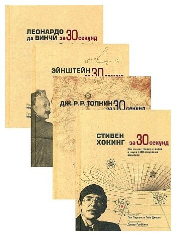 Стивен Хокинг за 30 секунд Книга "Стивен Хокинг за 30 секунд" - быстрое знакомство с удивительным гением нашего времени. Важные факты биографии ученого разделены на небольшие эпизоды - 30-секундные отрывки, которые представлены в кратком и доступном для понимания виде. Всего за несколько часов вы узнаете все о значимых моментах жизни и карьеры Стивена Хокинга, о его вкладе в науку, а также постигните тайну его теорий. Прочтите эту уникальную книгу - и Вселенная у ваших ног. Дж. Р. Р. Толкин за 30 секунд "Дж. Р. Р. Толкин за 30 секунд" идеально подходит для знакомства с необыкновенным писателем и мифотворцем. В этой книге вы найдете краткий биографический экскурс по жизни и творчеству Толкина, сможете заглянуть в его реальный и вымышленный миры и прикоснуться к истокам фэнтези - жанра, который до сих пор будоражит умы читателей и продолжает интересовать писателей, художников и кинорежиссеров. Эйнштейн за 30 секунд Книга "Эйнштейн за 30 секунд" - быстрое знакомство с величайшим гением всех времен. Важные факты биографии ученого разделены на небольшие эпизоды - 30-секундные отрывки, которые представлены в кратком и доступном для понимания виде. Всего за несколько часов вы узнаете все о значимых моментах жизни Эйнштейна, о его вкладе в науку и дальнейшем влиянии на развитие физики, а также познакомитесь с множеством тайн великого ученого. Эта книга является поистине уникальной, ведь ее можно прочитать со скоростью света. Леонардо да Винчи за 30 секунд Художник, анатом, архитектор, ботаник, картограф, инженер, математик, музыкант, ученый, скульптор - даже емким словом "эрудит" не выразить все таланты личности Леонардо да Винчи. Если дл вас он является только автором известной картины, на которой изображена Мона Лиза, воспользуйтесь шансом расширить свои познания!