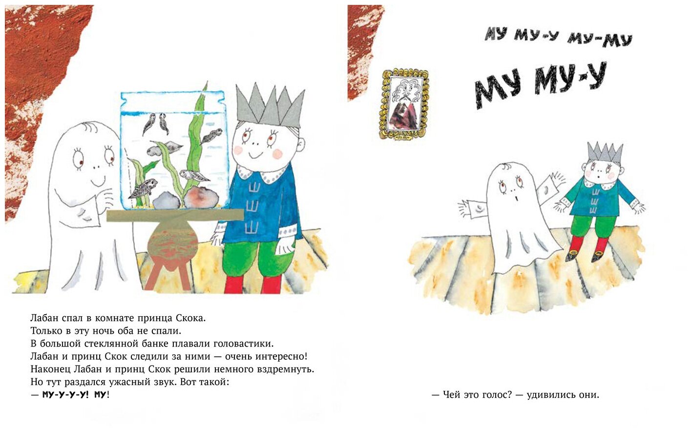 Книга очень понравилась трёхлетнем ребёнку, просил перечитывать. Ему очень нравится Лабан, маленькое забавное привидение и его семейство, другие герои со странными именами: принц Скок, принцесса Спок-по-скок, замок Проснись-и-пой... Звучит всё это странно впервые, но затем привыкаешь, тем более видя восторг ребёнка. Но главная приманка тут: путаница голосов животных. Всё это и вправду очень смешно и потешно, написано легко и непринуждённо, множество звукоподражаний животным так и привлекают детей. Нашему двухлетке тоже понравилось, хотя я думаю, в 3 года ему понравится ещё больше. Иллюстрации могут показаться непривычными, но они забавные, с достаточно яркой и разнообразной цветовой гаммой