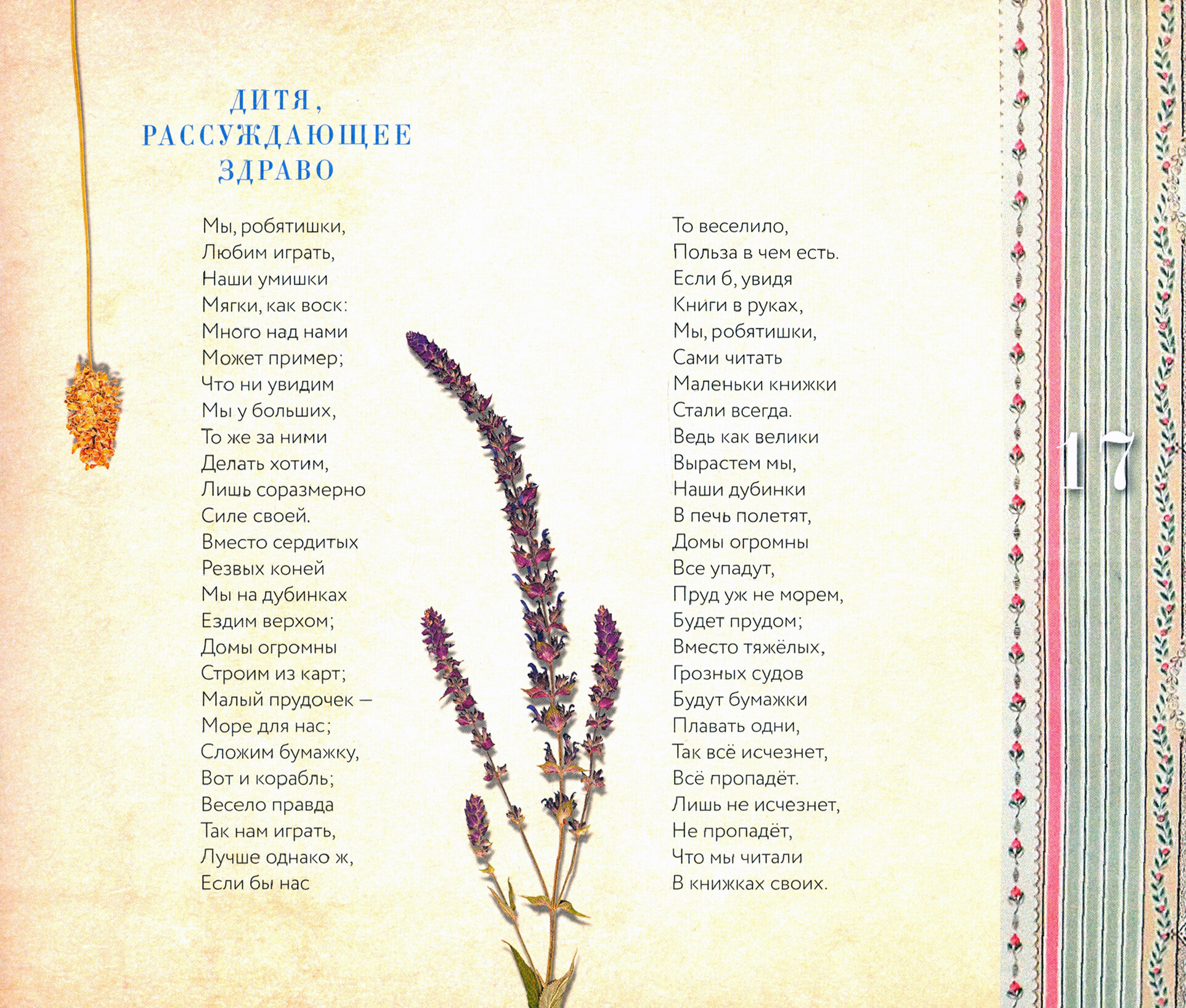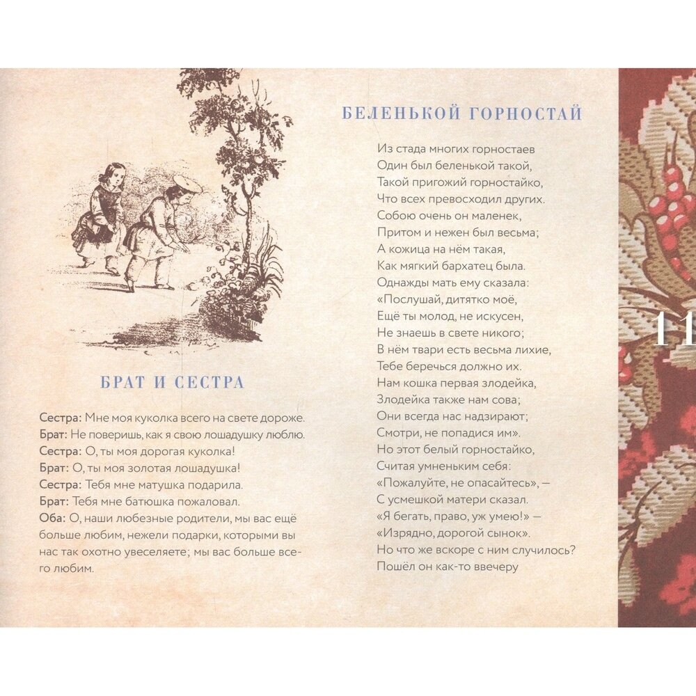 Великолепно оформленное издание! Очень стильное, иллюстрации винтажные, книга выполнена с большим вкусом и очень подходит содержанию самих стихов. В нее входят три автора, которые перечислены на обложке. Даётся не большое повествование о каждом из них, творчестве. Наверное они не самые известные, но стихи написанные ими именно для детей, хотя и выходили давно. Эти детские произведения отличает и своеобразие языка того времени, лексика, особая связь с природой, в которой раньше жил человек. А так же те моральные принципы и законы, которыми руководствовались люди того времени. Часто в стихах присутствует прямая назидательность, адресованная ребенку, мораль, вывод. Есть в книге и переводные стихотворения. Конечно, эти стихи отличаются от современных, обычных детских произведений. Они другие.