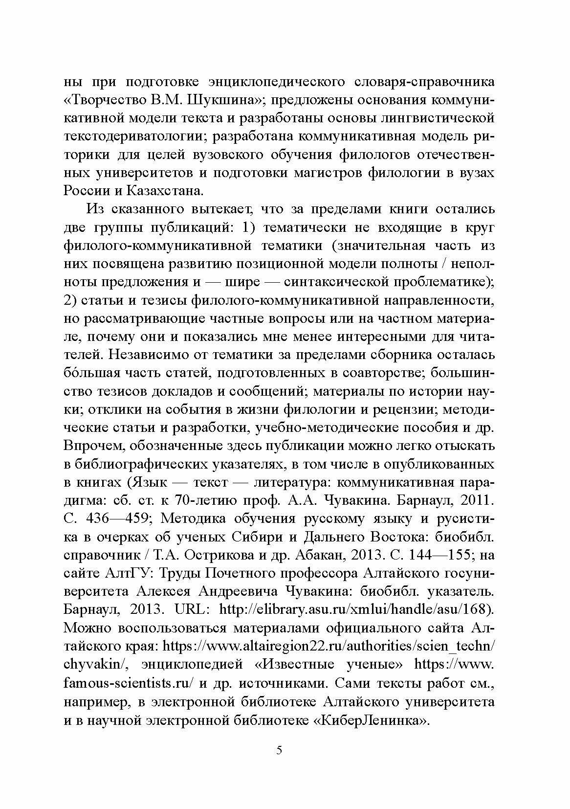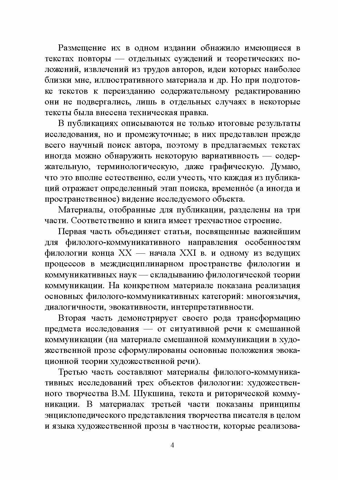 Книга включает ряд работ автора по общей и русской филологии, опубликованных преимущественно в середине 1990-х годов - XXI в. Рассматриваются проблемы объекта современной филологии, взаимодействия филологии и коммуникативных наук; выдвигается гипотеза о построении филологической теории коммуникации, на большом фактическом материале демонстрируется ряд филологических категорий коммуникации (многоязычие, диалогичность, эвокативность, интерпретативность). Большое место занимает рассмотрение выдвинутых исследователем феноменов ситуативного типа речи и смешанной коммуникации. Значительное место уделено художественному творчеству В.М. Шукшина, тексту, риторической коммуникации. В книге представлена проекция теоретических результатов на сферу высшего филологического образования и область энциклопедической лексикографии: А.А. Чувакин является автором и научным редактором университетских учебных пособий по основам филологии, теории текста, риторике, филологии в ее взаимосвязи с коммуникативными науками, а также научным редактором энциклопедического словаря-справочника "Творчество В.М. Шукшина".