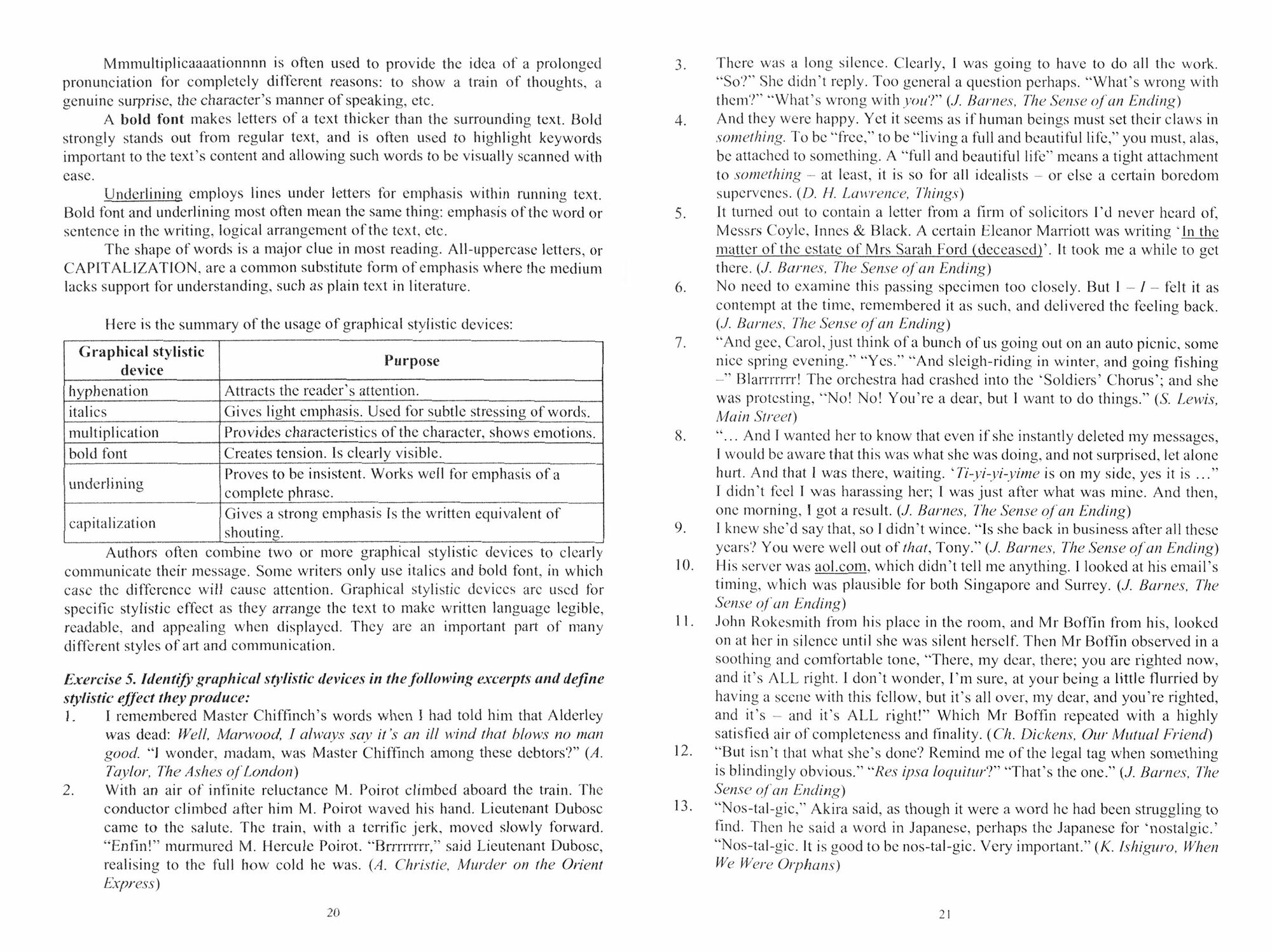 Пособие включает четыре раздела и дополнительные упражнения. В разделах рассматриваются основные стилистические приемы, представленные на различных языковых уровнях. Каждый раздел содержит практическую часть, направленную на закрепление теоретических положений. Дополнительные упражнения позволяют упрочить полученные практические навыки по определению стилистических приемов, выполняемых ими функций и создаваемых ими стилистических эффектов. Источниками упражнений в практической части пособия послужили произведения классических и современных англоязычных авторов; источниками теоретических положений и иллюстративного материала являются интернет ресурсы.