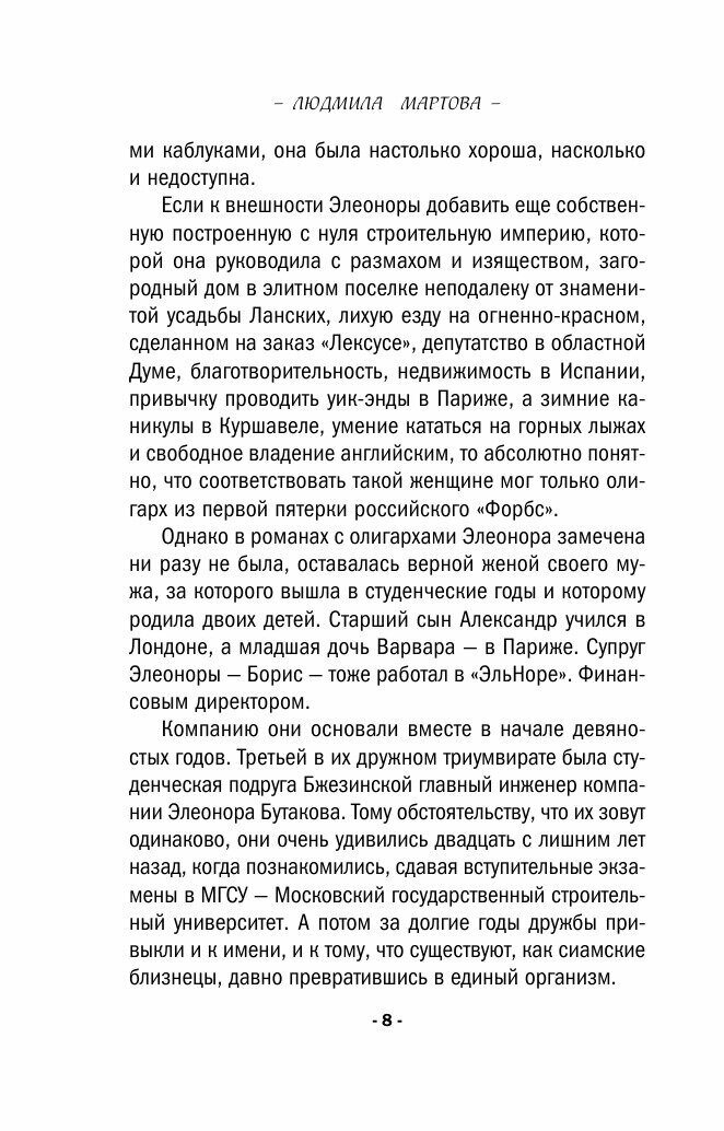 Этого автора совершенно не знала, купила по совету сотрудницы магазина, девушка с таким восторгом отзывалась о книгах Людмилы Мартовой, что я попала под обаяние рассказчицы и купила сразу четыре книжки. Книга не понравилась, странная она какая-то, весь сюжет строится на том, что у двух главных героинь одинаковые имена и автор пытается запутать читателя, а в результате, похоже, запутывается сама. Надеюсь, что оставшие три книжки будут более интересны.