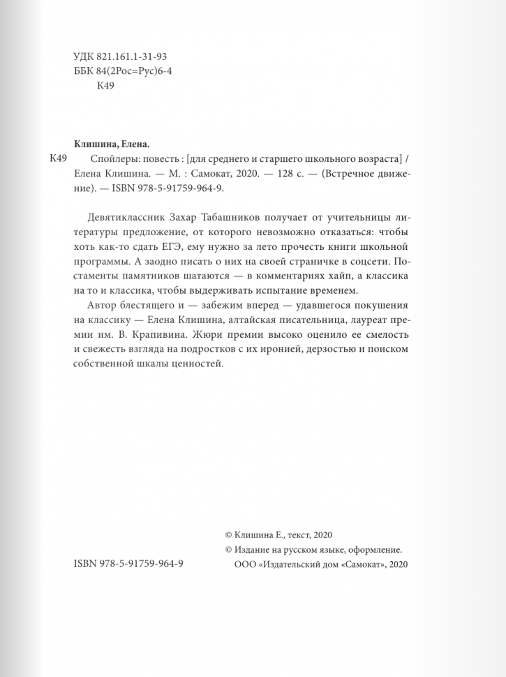 Книга: Спойлеры (Елена Клишина); Издательство "Самокат", 2020