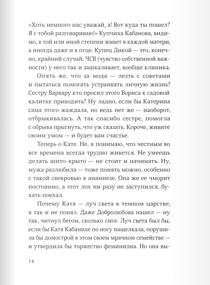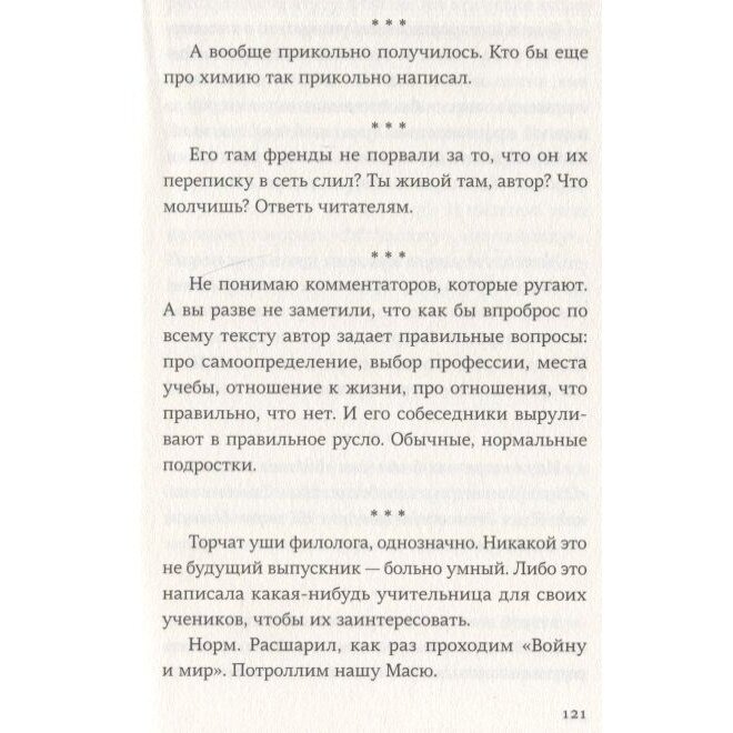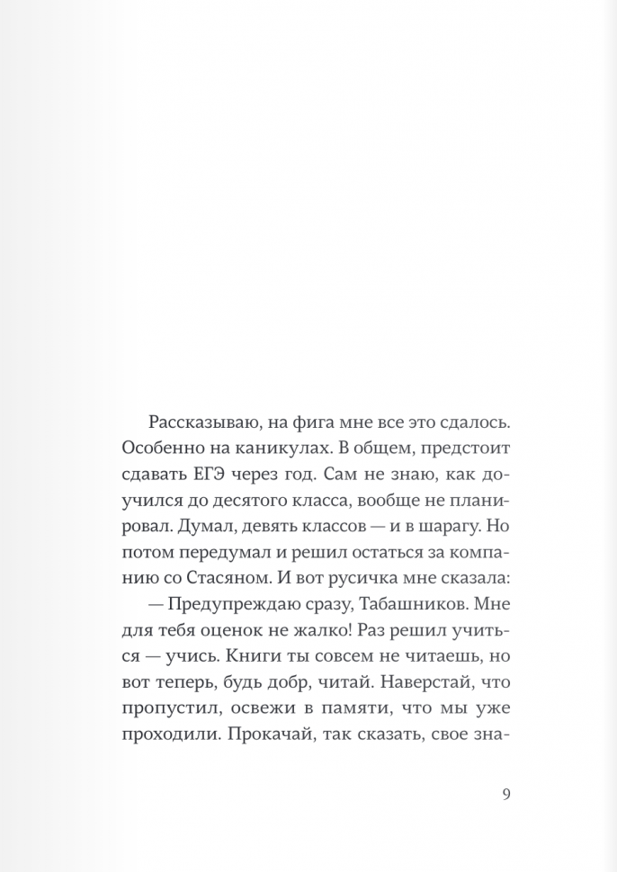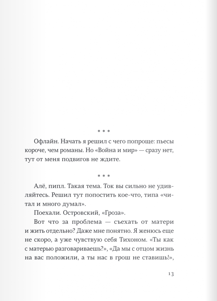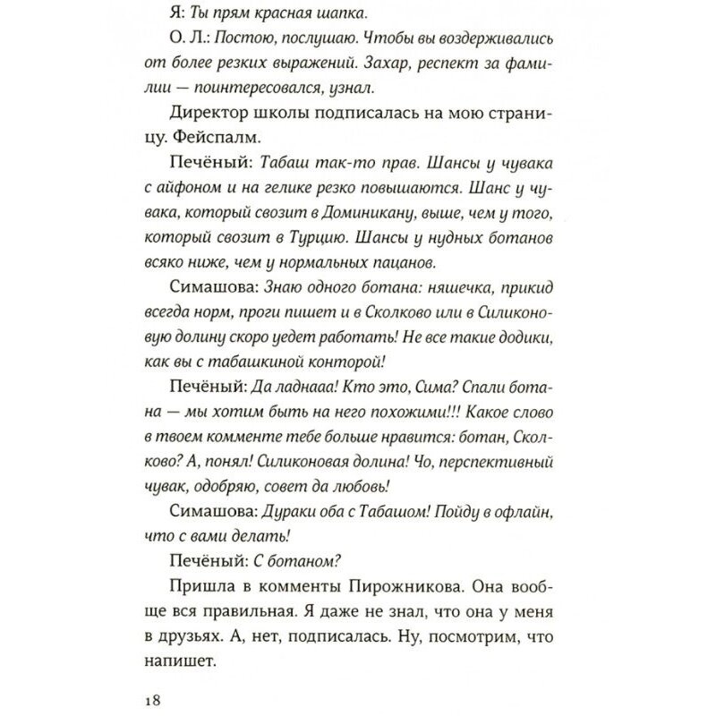 Весело, актуально, правдиво! Автору действительно «респект и уважуха»)) Он, пусть и очень концентрированно, но смог зафиксировать и передать речь нынешних подростков. Сленг десятиклассников в книге не имитация. Читаешь и веришь каждой реплике. А самое главное, когда вспоминаешь свои школьные впечатления от классики русской литературы, становится до слез смешно, что воспринимала все так, как Захар Табашников!