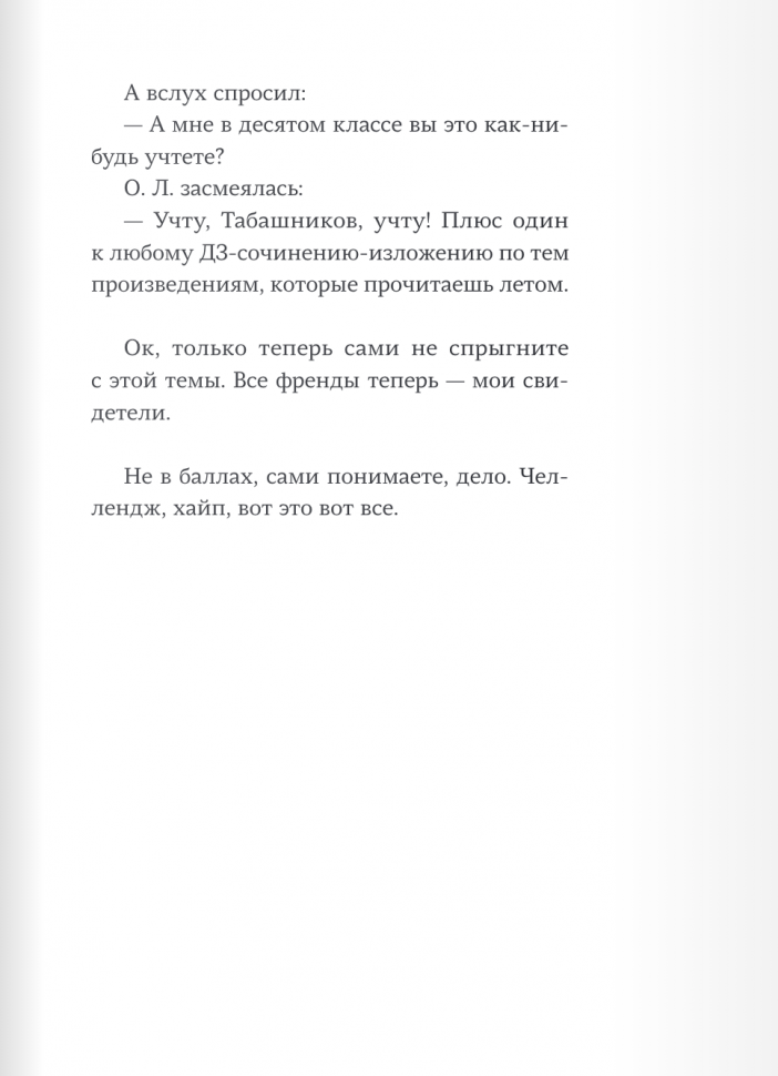 Безумно замечательная книга, прочитала за вечер! О том как подростки воспринимают классику в современном мире! Учитель Ольга Леонидовна пытается замотивировать девятиклассника Захара Табашникова. Она даёт ему задание, прочитать за лето книги школьной программы за год и написать о них отзывы в сети! За это она накидывает ему балл к любому дз-изложению-сочинению в 10 классе. Так начинается его челлендж. Конечно не обойдётся без комментариев одноклассников и учителя, завуча и детектора и в конце концов мамы! Но самое главное, ему понравится читать, значит все старания не напрасны??! Обожаю книги про учителей!