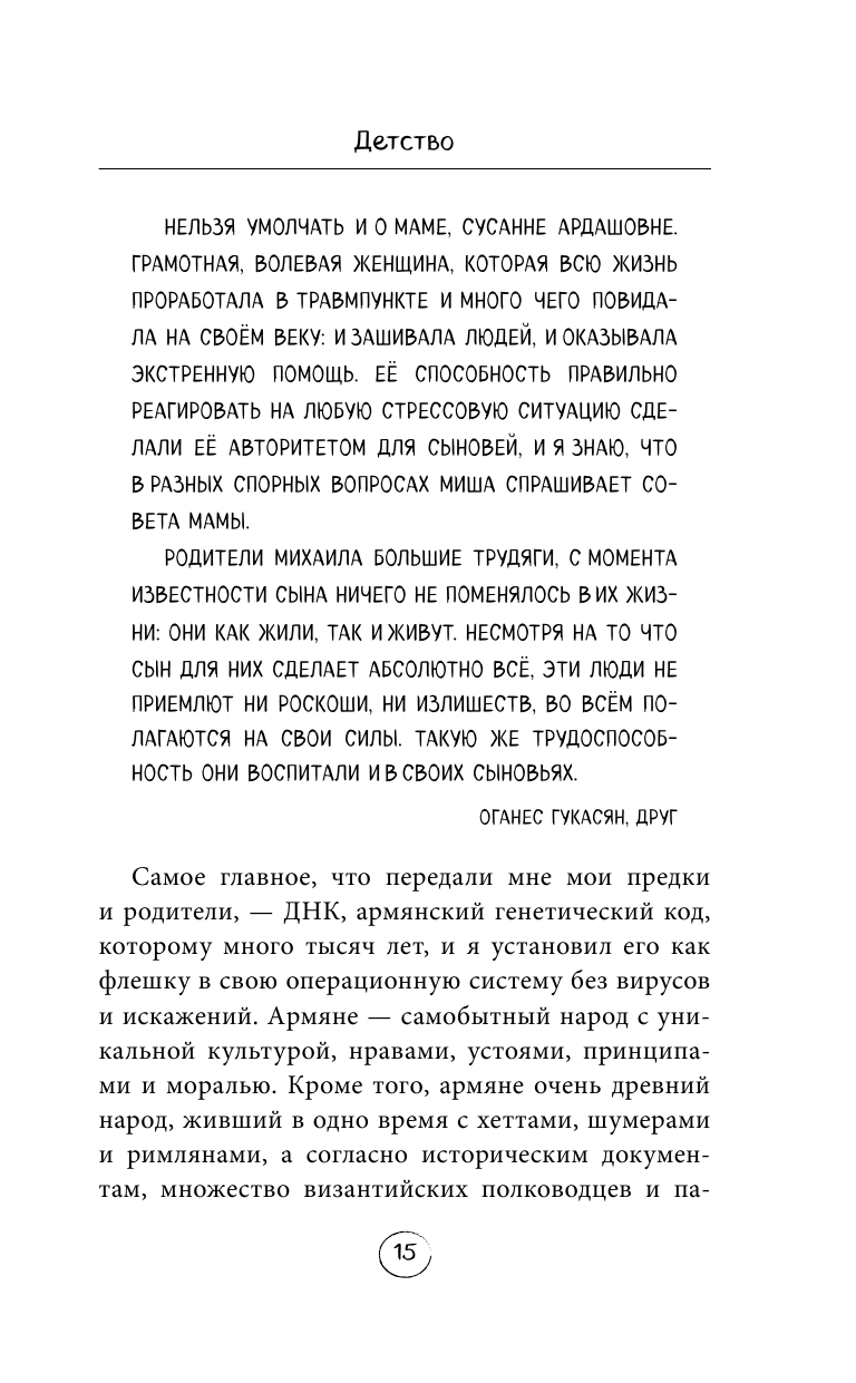 Автобиография проиллюстрирована рассказами близких друзей: Гарика Мартиросяна, Армена Ананикяна, Александра Реввы и других, родителей и жены Виктории Галустян.