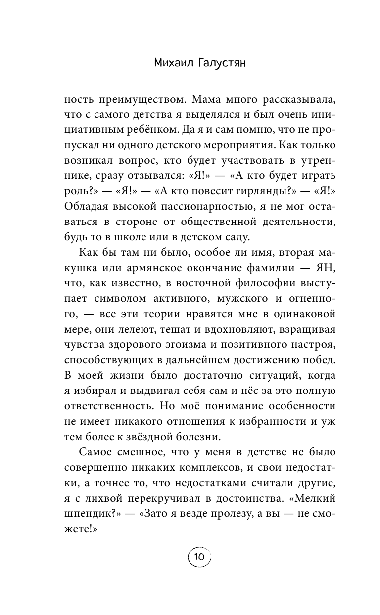 Книга читается на одном дыхании!!! Будет любопытна и тем, кто иниересуется КВНом, и тем, кого вдохновляют истории успеха! Потому что Михаил Галустян - это человек, действительно, добившейся многого в жизни. В книге он не только рассказывает о себе, вспоминает забавные истории, но и выводит правила, которые помогли ему стать известным на всю страну.
