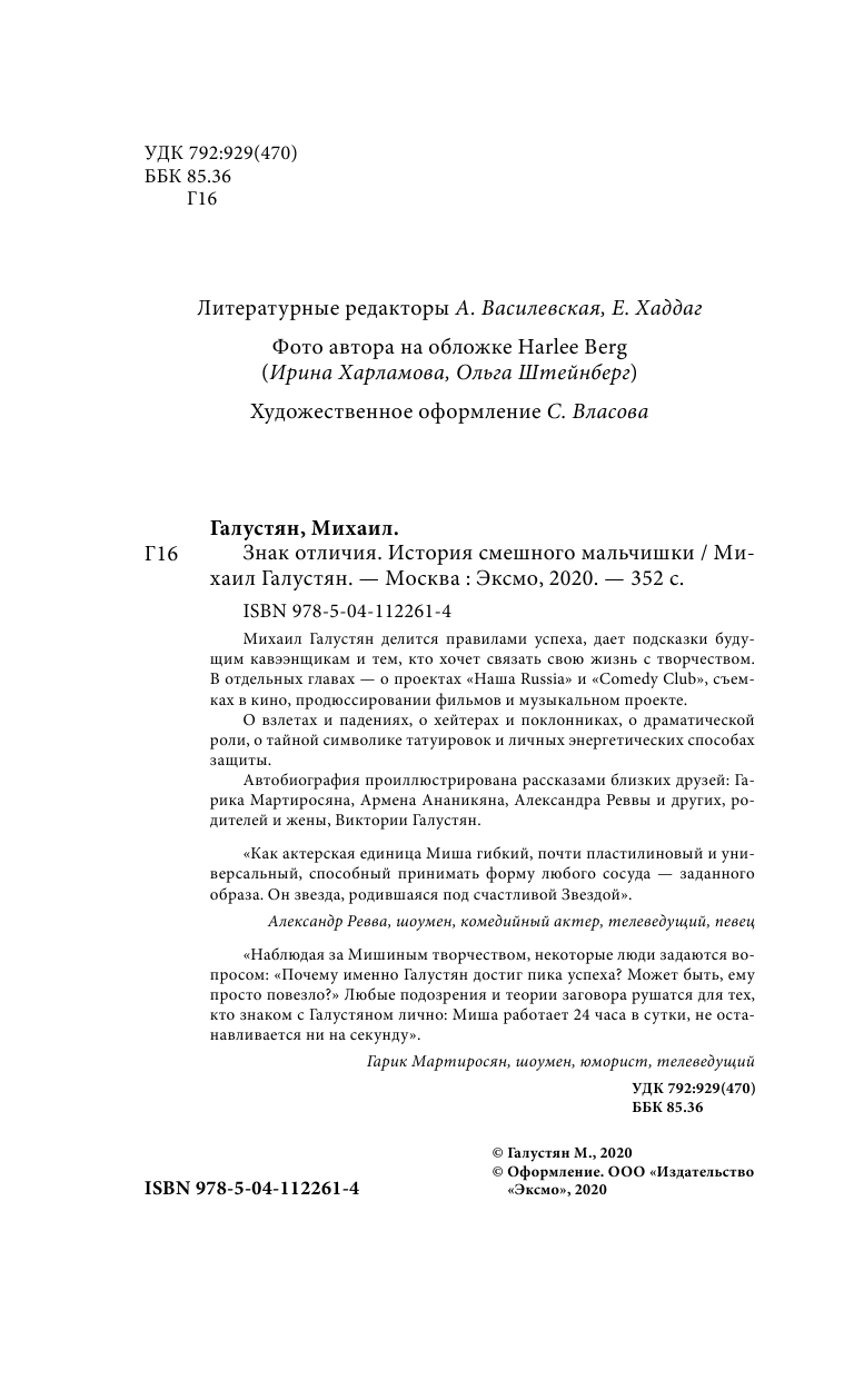 довольно информативная книжка. узнал о Галустяне почти всё то, что хотел. в данной книге он рассказывает: о своих родителях; о своем детстве и юношестве; на своем пути в КВН; а нынешний сферах своей деятельности; о своём отношении к семье и дружбе; о своём понимании мира и т.п. Мне книжка понравилась. из недостатков отмечу отсутствие иллюстраций и комментариев о галустяне ребят из Сomedy club (только Ревва, а остальные продюсеры и шишки кавказской наружности)