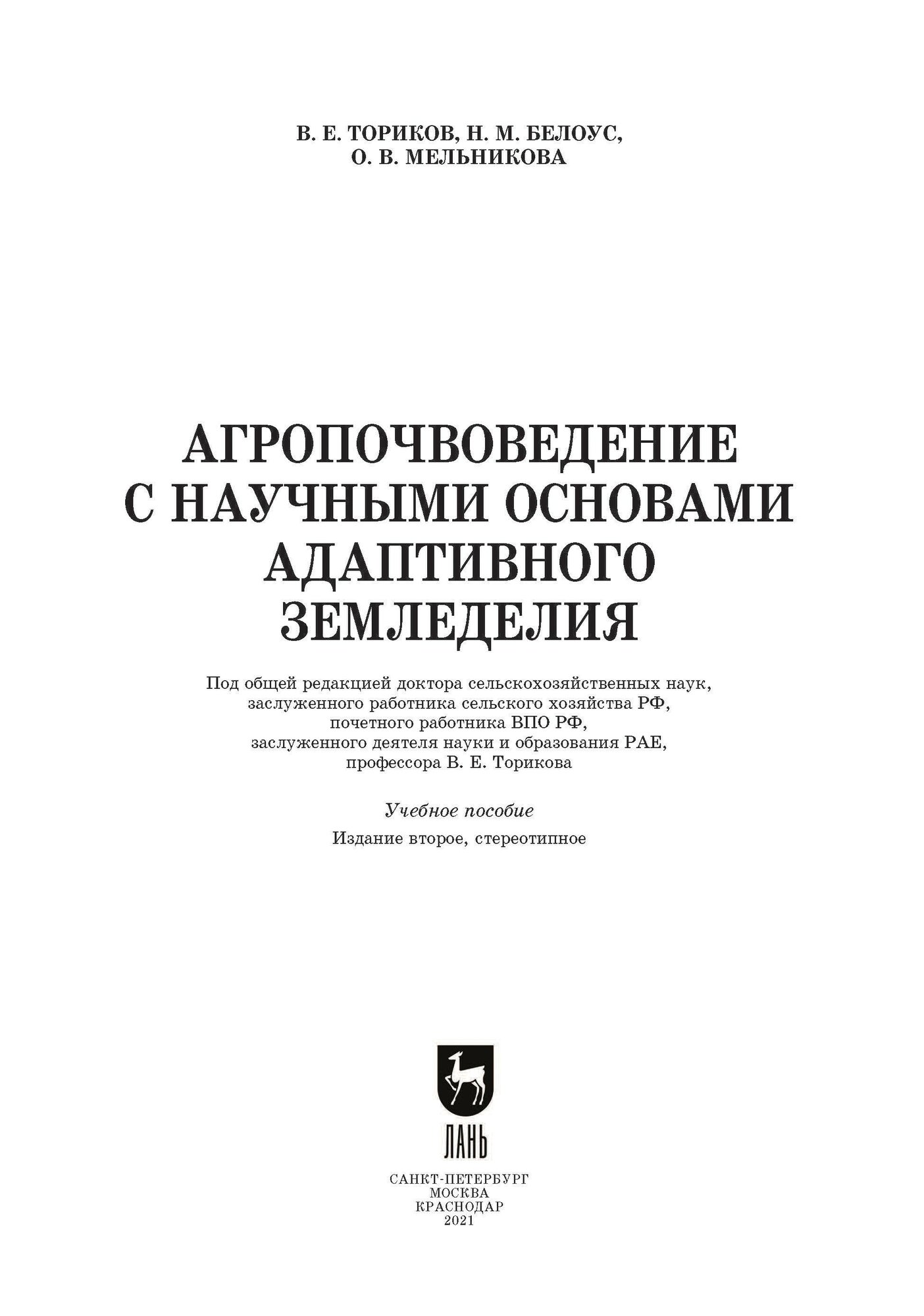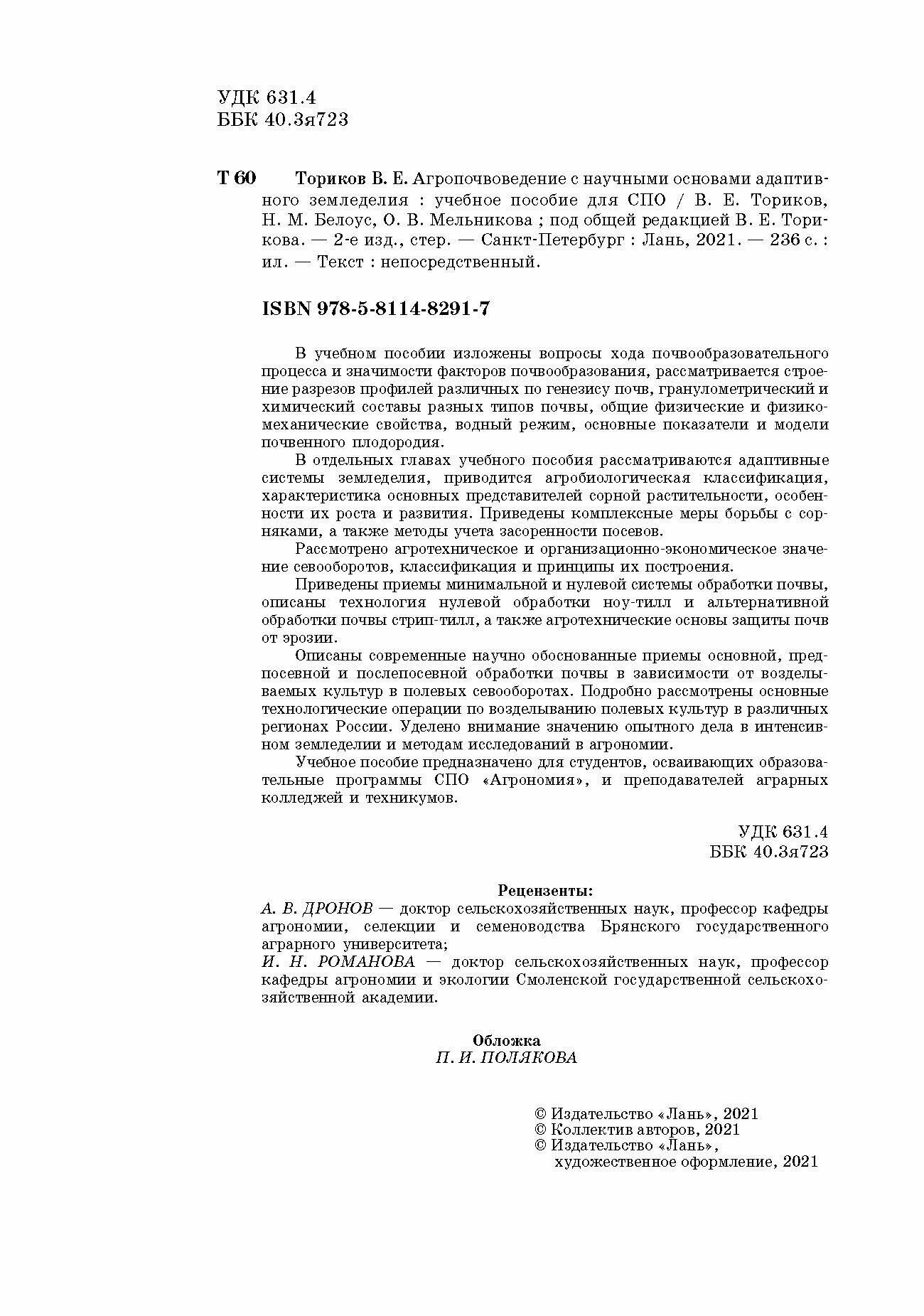 Агропочвоведение с научными основами адаптивного земледелия. Учебное пособие (Ториков Владимир Ефимович, Мельникова Ольга Владимировна, Белоус Николай Максимович); Лань, 2020