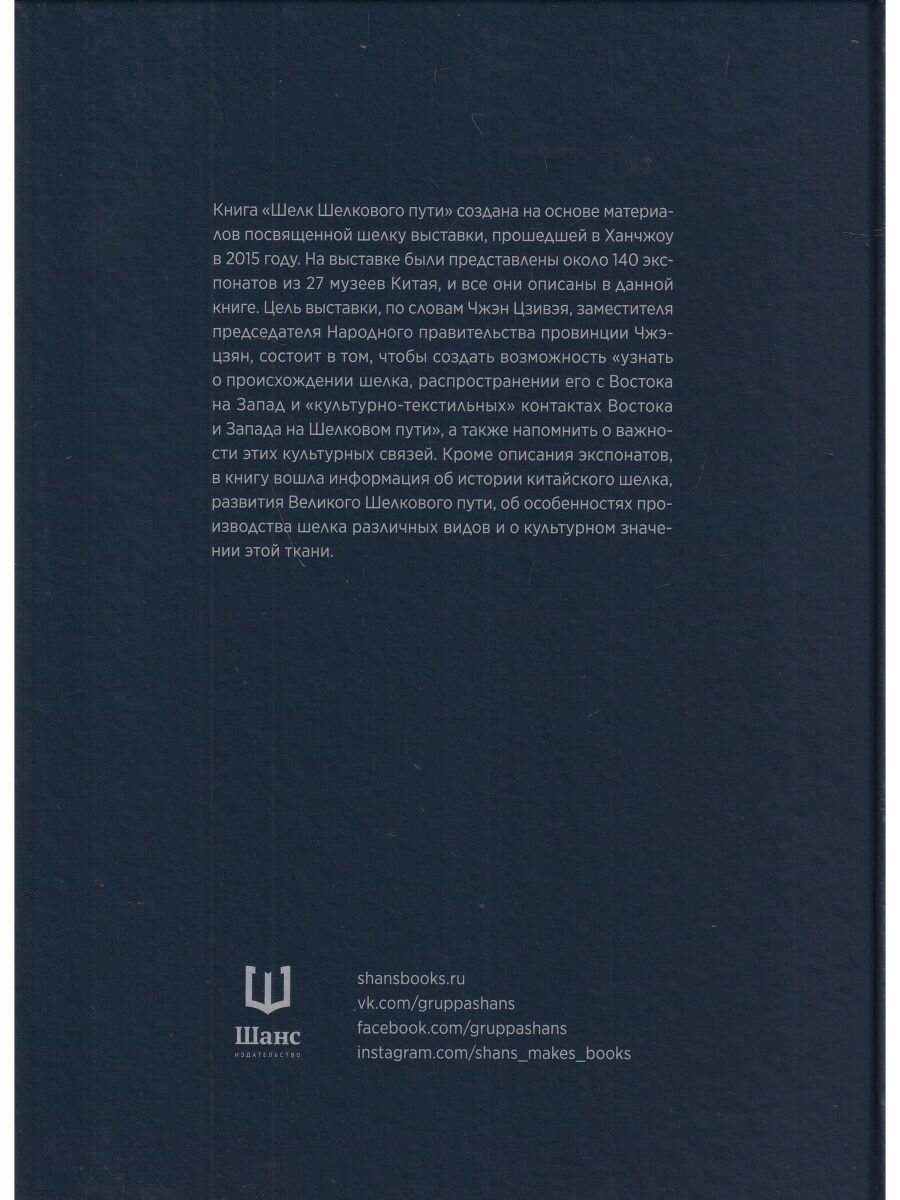 Эта книга создана на основе материалов прошедшей в Китае выставки, посвященной шелку. Торговля шелком рассматривается как толчок к взаимному влиянию культур Востока и Запада и как первопричина возникновения Шелкового пути. В книге раскрывается история развития производства шелка и способов его распространение как внутри страны, так и по всему миру, а также описываются современные технологии обработки и сбыта шелка.