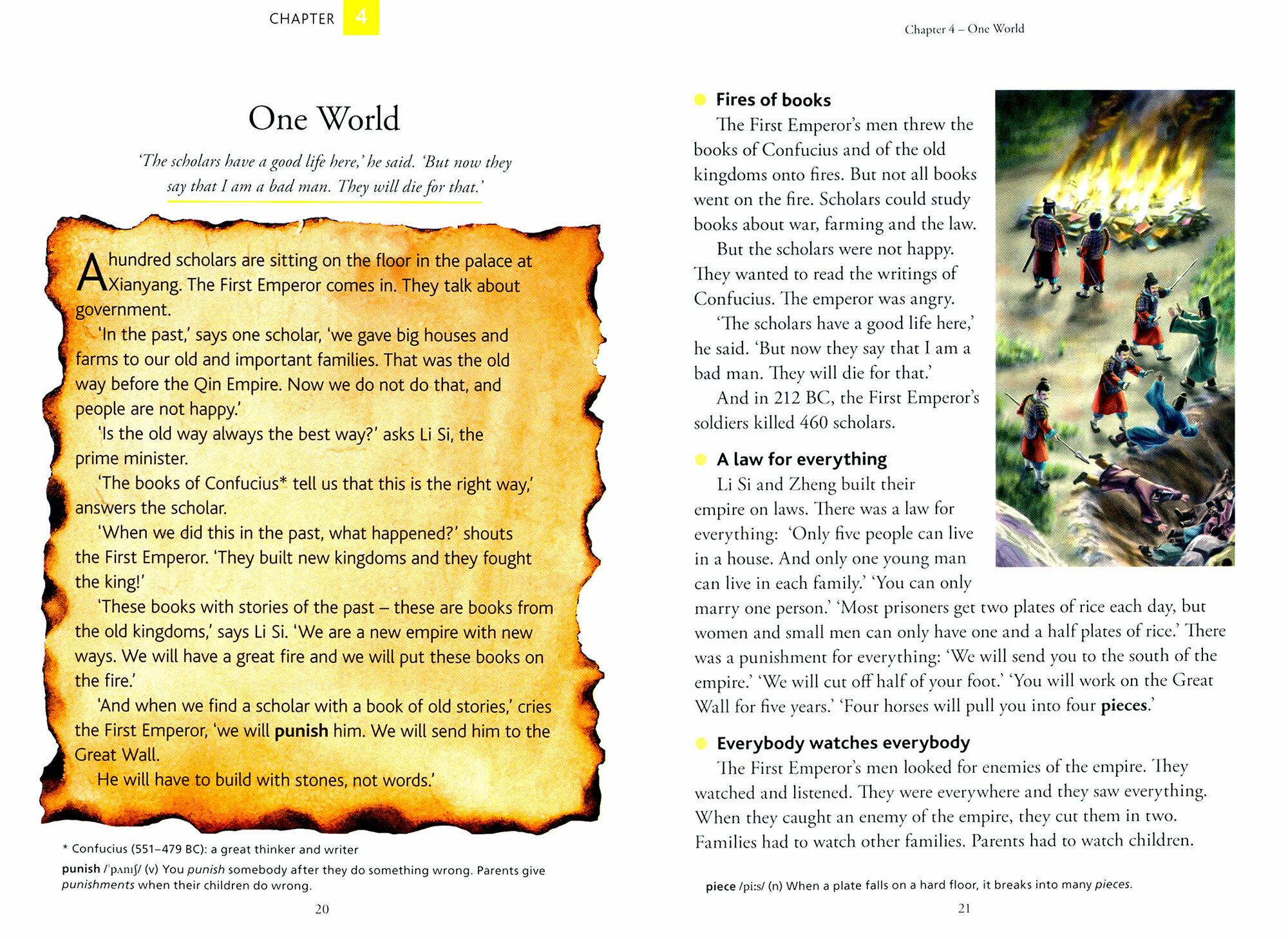 Around the Ying Zheng, king of Qin, became the first emperor of China. He had new ideas and made new laws. He built big palaces – and a great wall. But life was difficult for his people and dangerous for the emperor. So he took an army with him into the next world.