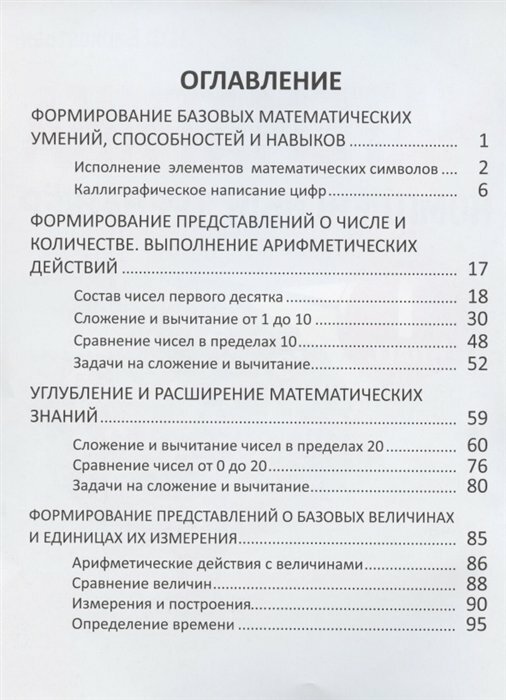 Данное пособие понравилось мне своей многогранностью, это действительно "комплексный" тренажёр. Задания каждого раздела построены по принципу "от простого к сложному". Так, например, при отработке написания цифр сначала предлагается потренироваться выполнять отдельные элементы цифры, затем две строчки обвести уже написанные пунктиром цифры, а уж потом попрактиковаться в самостоятельном написании. Несколько вариантов заданий даны для закрепления темы "Состав числа". Тема, на мой взгляд, достаточно скучная, но крайне важная (если её хорошо усвоить, не будет проблем с устным счётом). И автору удалось предложить несколько отличающихся друг от друга заданий, что поможет ученику не заскучать. Отдельно хочу сказать о примерах на сложение и вычитание (как с однозначными, так и с двузначными числами): здесь не только обычные "1+1=2", но и примеры, в которых пропущено одно из слагаемых, (или уменьшаемое, или вычитаемое). Особая благодарность автору за задания типа "Найди разность...", "Уменьши на...", "Сложи числа...". Такие задания помогут ребенку лучше ориентироваться в терминологии, а также понять, что одно и то же задание может быть по-разному сформулировано