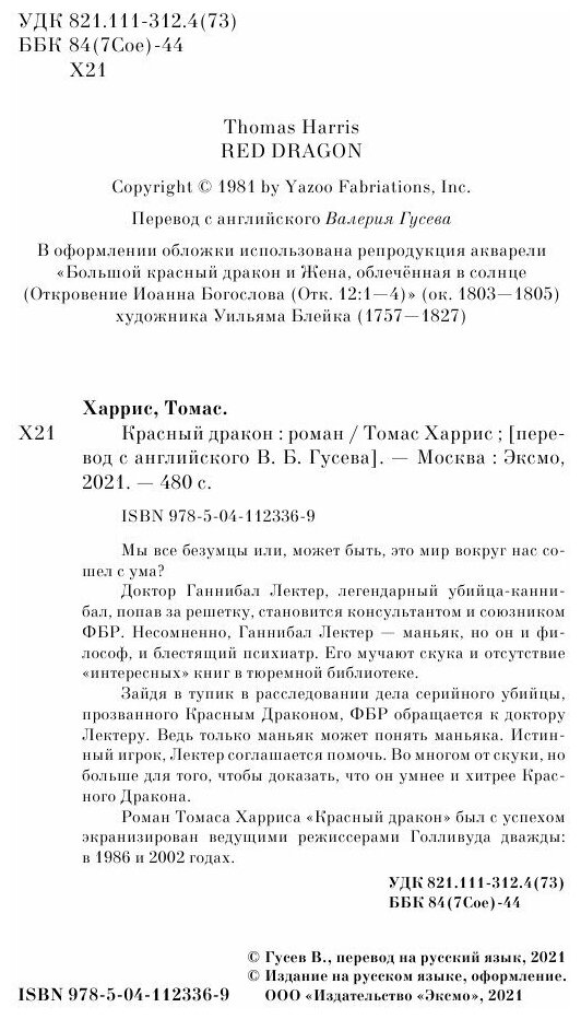 P.S. Я очень падкая на музыку, картины, любые произведения искусства, которые упоминаются в книгах. Тут же начинаю искать их, узнавать что-как, понять, выяснить (для меня это дополнительная, точечная мотивация в познании чего-то неизвестного для меня). «Красный дракон» – это картина художника У. Блейка, на которую Харрис делает отсылки в ходе повествования (она же изображена на обложке моего книжного издания). И это тот случай, когда ничего не поняла и никак не прониклась. Это дает мне надежду думать, что я не психопат))))
