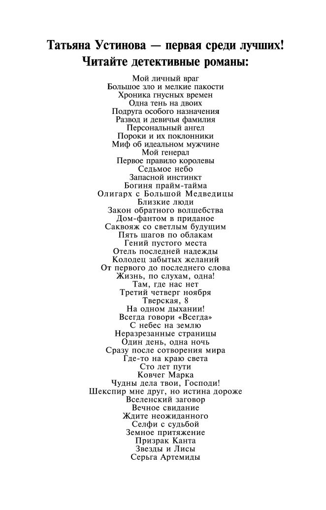 Совершенно замечательная книжка. Давно люблю автора,есть в наличии всё,перечитываю порой... Стараюсь читать не быстро,продлеваю удовольствие... Всегда остаётся приятное впечатление,и пусть как в сказке каждый находит любовь и благополучие,юмор и ирония так приятны. ... Это книжки лёгкого чтива,жизнь и так у нас не сказать,что радостная... И именно книг этого автора всегда жду.,нахожу отдушину в чтении... Спасибо большое! Здоровья и успехов Тане!