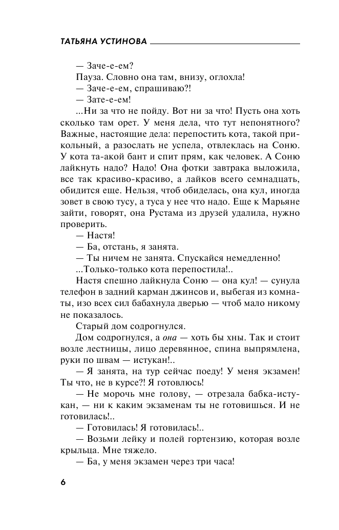 Обожаю творчество Татьяны Витальевны, но с этой книгой любимый автор явно подкачала, не хочется писать много слов, просто коротко: нет интриги, сюжет не захватывает, образы персонажей типовые, очередная умная, уставшая, далеко не юная женщина (их таких было две, мать и дочь) находит любовь всей своей жизни в виде успешного, богатого мужика, решающего все проблемы одним взглядом. И жили они долго и счастливо. Но, творческие кризисы бывают у всех, надеюсь дождаться нового прорыва в авторской деятельности Устиновой.