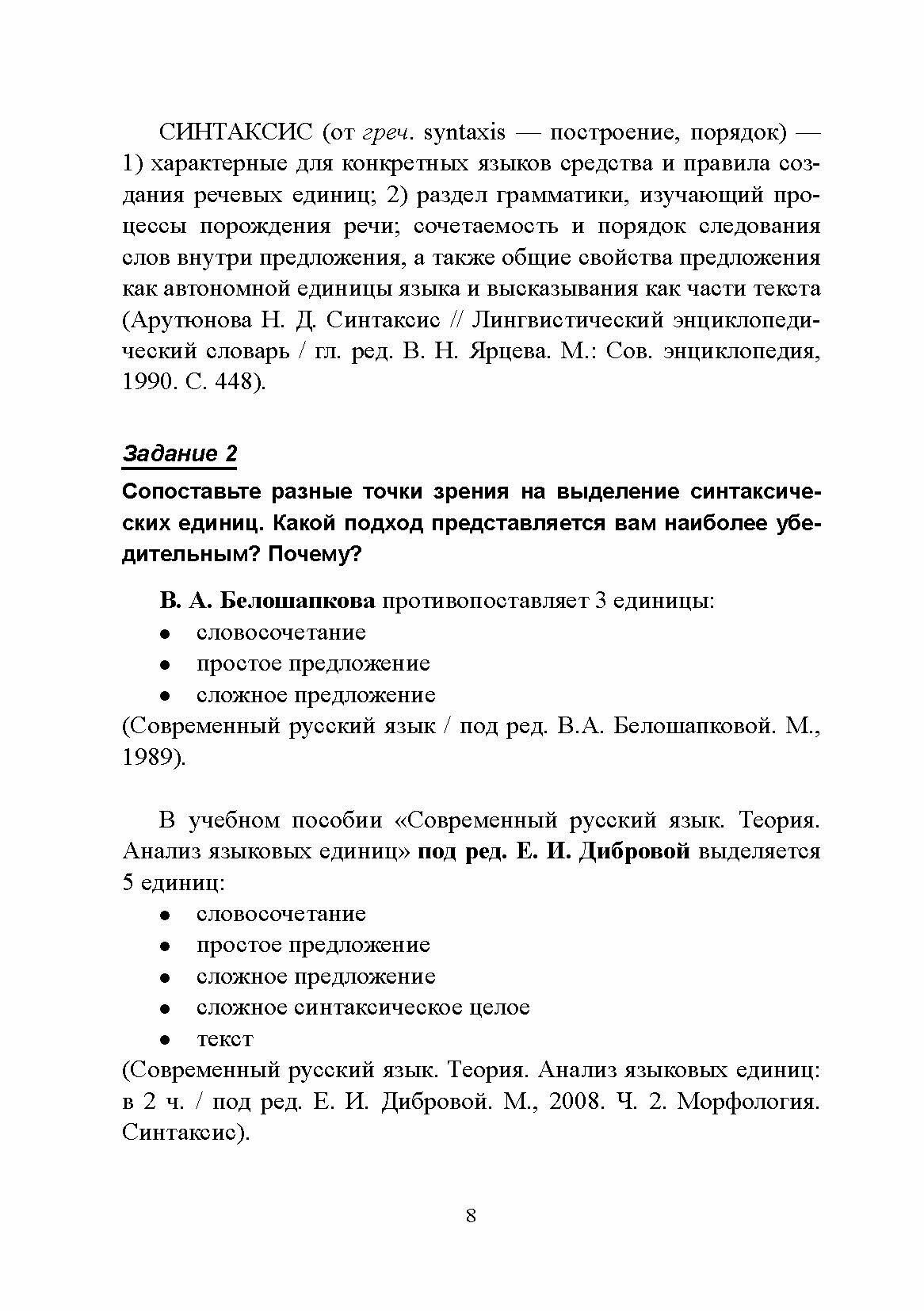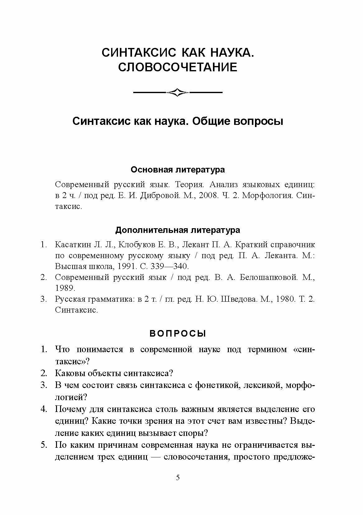 Учебное пособие содержит сведения о синтаксисе как научной и учебной дисциплине, о синтаксических связях и отношениях, информацию о таких синтаксических единицах, как словосочетание, простое предложение, сложное предложение, сложное синтаксическое целое, текст. Включает теоретические вопросы и краткие справочные сведения по основным темам курса, систему задач и упражнений, списки основной и дополнительной литературы.