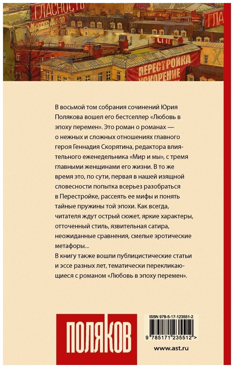 В восьмой том собрания сочинений Юрия Полякова вошел его бестселлер "Любовь в эпоху перемен". Это роман о романах - о нежных и сложных отношениях главного героя Геннадия Скорятина, редактора влиятельного еженедельника "Мир и мы", с тремя главными женщинами его жизни. В то же время это, по сути, первая в нашей изящной словесности попытка всерьез разобраться в Перестройке, рассеять ее мифы и понять тайные пружины той эпохи. Как всегда, читателя ждут острый сюжет, яркие характеры, отточенный стиль, язвительная сатира, неожиданные сравнения, смелые эротические метафоры. В книгу также вошли публицистические статьи и эссе разных лет, тематически перекликающиеся с романом "Любовь в эпоху перемен".