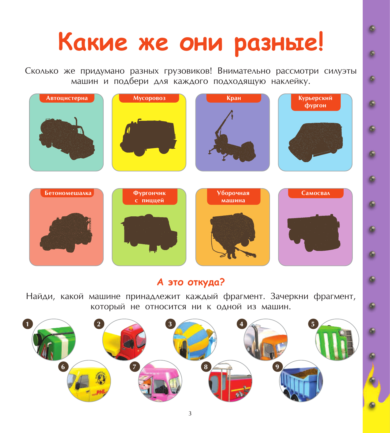 В книге есть главный герой с русским именем,задания найди отличия, соедини по точкам, найди тень, грузовик в деталях, пазлы-наклейки, лабиринты, судоку,раскраска, домино,счёт, и другие на внимательность и логику плюс игра бродилка. Ребенку почти три года, часть заданий делает, часть ещё не актуальна. -